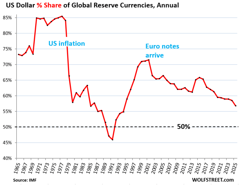 The dominance of the US dollar in global finance is facing a slow but persistent shift. According to the latest IMF data on the Currency Composition of Official Foreign Exchange Reserves (COFER), the US dollar’s share of global reserves has dropped to 56.8% as of Q4 2025—its lowest level since 1994.
