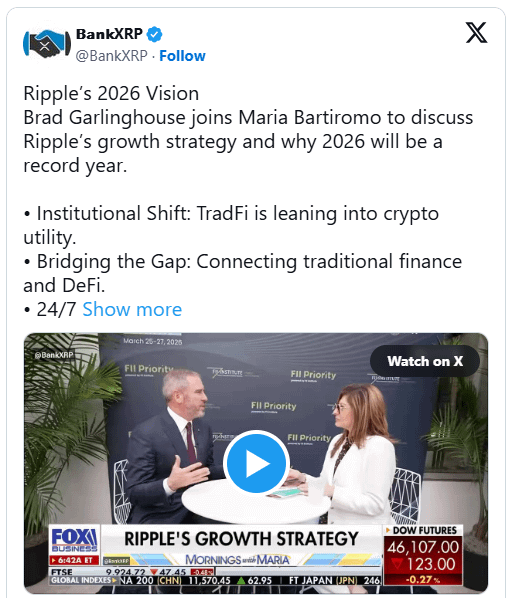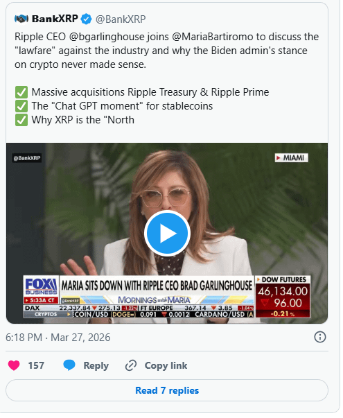 Der Markt handelt im Moment nicht mit Ripples Fahrplan. Er handelt mit dem Iran-Konflikt, ETF-Strömen und einem makroökonomischen Umfeld, das kein Interesse daran gezeigt hat, zwischen einem Projekt zu unterscheiden, das diese Woche seine Sicherheitsinfrastruktur überholt hat, und einem, das dies nicht getan hat. Goldman Sachs hält 152 Millionen $ in XRP ETF-Produkten. Der MAS BLOOM-Pilot ist aktiv und markiert die dritte große Entwicklung in weniger als einem Monat. Der CLARITY Act steht in wenigen Wochen zur Abstimmung im Senat, so Garlinghouse. Nichts davon spiegelt sich im Preis wider.
