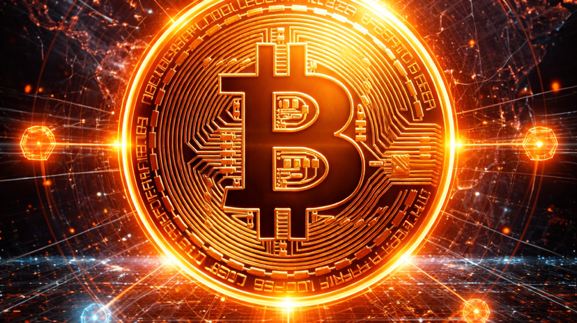 “A futuristic digital gold coin with the Bitcoin symbol glowing in the center, surrounded by blockchain nodes and global network connections, dark background with neon orange highlights, professional crypto finance style, high detail, cinematic lighting”