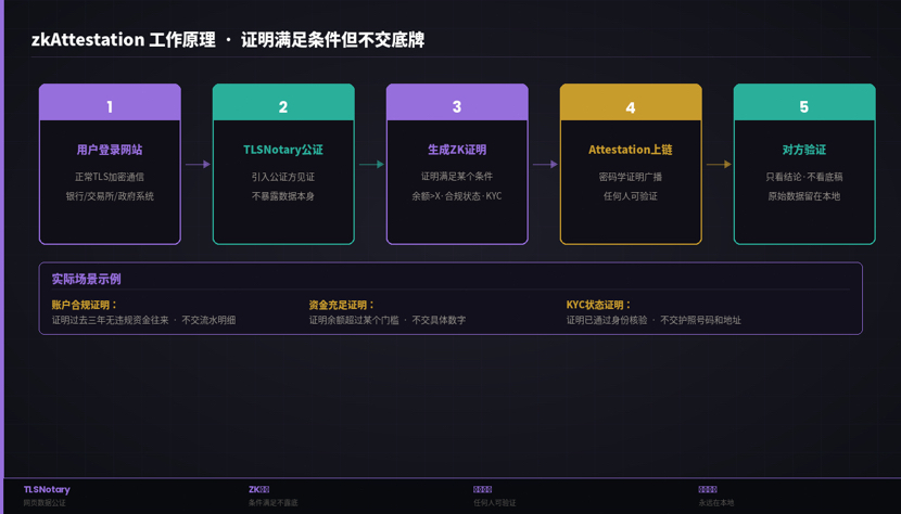 Die Grundlage nutzt das TLSNotary-Protokoll – wenn der Benutzer sich auf einer Website anmeldet, findet die TLS-verschlüsselte Kommunikation zwischen Browser und Server normal statt, aber TLSNotary führt in diesem Prozess einen Notar ein, sodass der Benutzer nachträglich beweisen kann, dass „ich diese Daten von dieser Website erhalten habe“, ohne die Daten selbst offenzulegen.