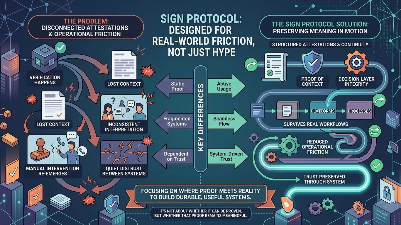 Wenn ein Projekt das bedeutend reduzieren kann, hat es einen Grund, jenseits eines einzelnen Marktzyklus zu existieren. Das ist der Maßstab, zu dem ich immer wieder zurückkomme, und deshalb fühlt sich das Sign Protocol wertvoll an, auch wenn ich noch nicht ganz überzeugt bin. Denn das Projekt scheint etwas zu verstehen, das viele andere übersehen: Vertrauen geht nicht nur darum, Informationen zu speichern, es geht darum, die Bedeutung zu bewahren, während diese Informationen durch ein System fließen.