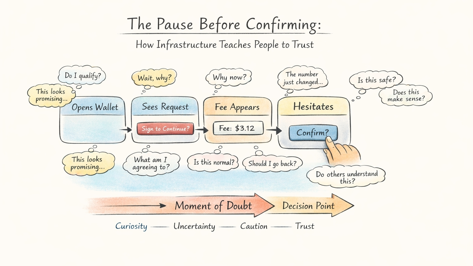 It does not last very long. Sometimes only a second or two. But it is often the most honest moment in the entire experience. The wallet is open. The page is waiting. The user has already come this far, already connected, already followed the instructions, already been told they are eligible or verified or included. And still, right before committing, they pause.