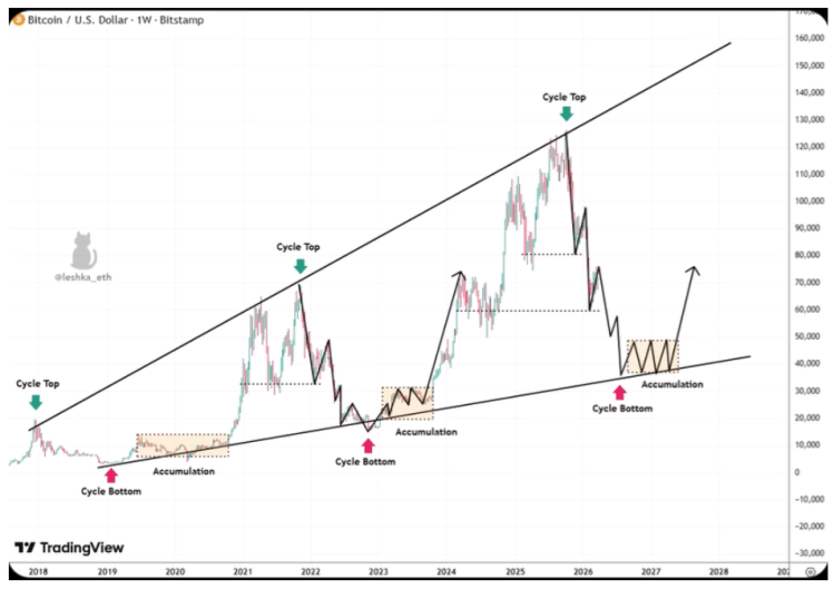 Esa cifra de los $40k no es inventada; es la línea de tendencia macro que conecta los mínimos de 2018, el bajón de 2020 y el mercado amargo de 2022. Es el punto donde el precio siempre regresa para tomar impulso antes de un gran salto. Básicamente, si el soporte de los $60k falla, nos toca prepararnos para una fase de acumulación larga, donde el mercado se queda "plano" mientras junta fuerzas para volver a empezar. ⏳