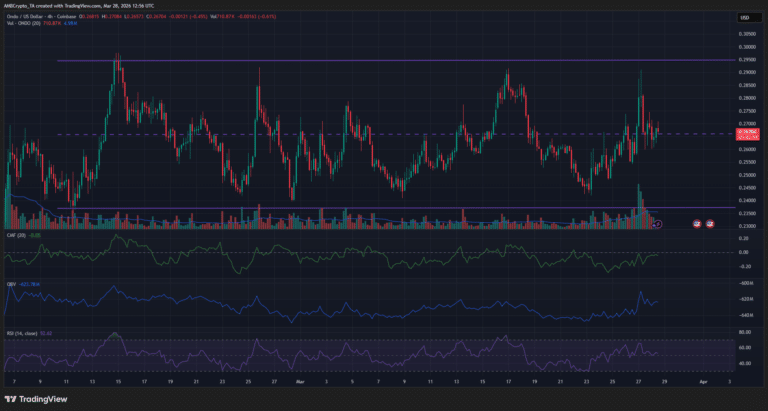 Lo que realmente me vuela la cabeza son los datos de Coinalyze. A pesar de los sustos del pasado viernes 27 de marzo, el Interés Abierto (la plata que la gente está apostando en contratos) y el CVD al contado (compras reales de la moneda, no solo apuestas) están subiendo. Esto significa que hay gente con billete en mano comprando ONDO de verdad, no solo especulando por un rato. Además, la alianza con gigantes como Franklin Templeton le da un respaldo institucional que no podemos ignorar, aunque el precio todavía no haya reaccionado con euforia a esa noticia. 🏛️🤝