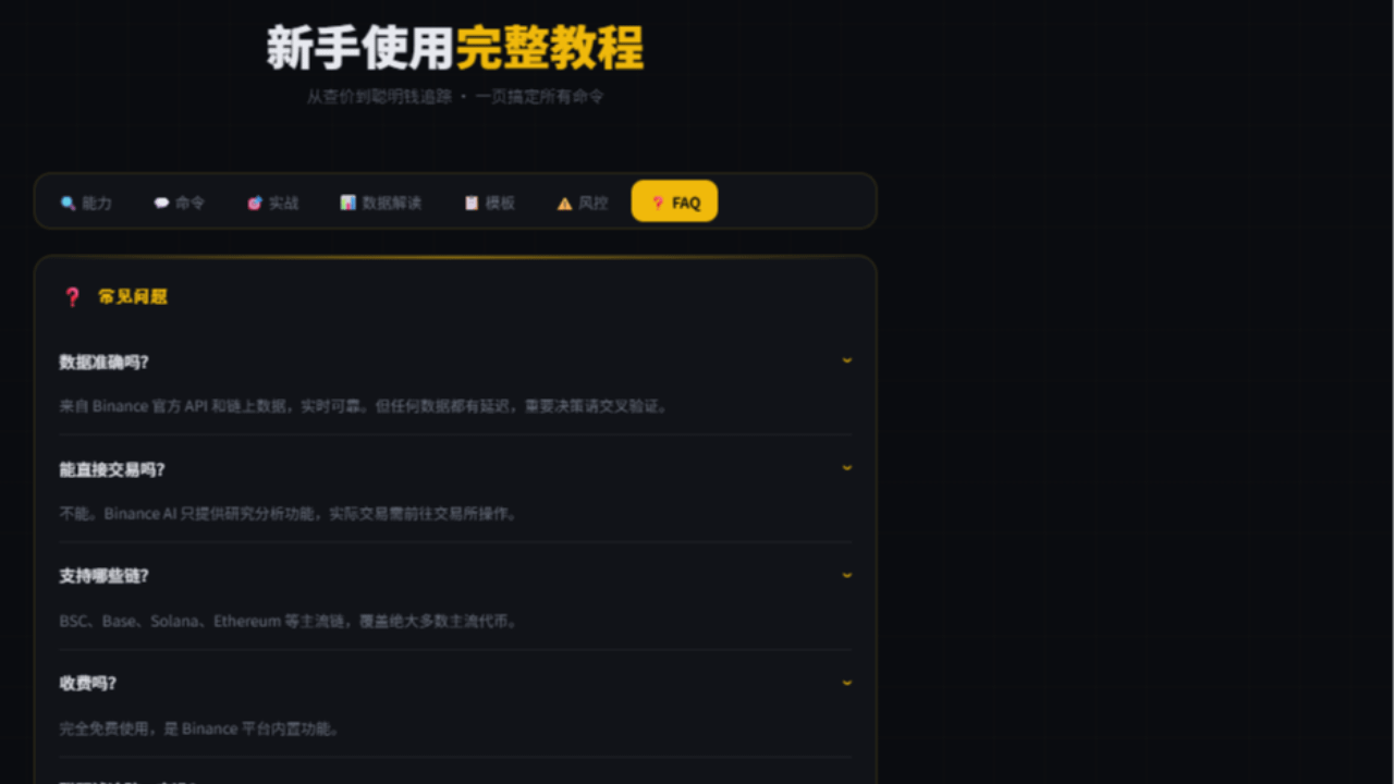 Binance AI ist im Wesentlichen ein Abfrage- und Analysewerkzeug, das auf der Binance-Plattform hängt, mit Daten, die direkt von der Blockchain und der offiziellen API stammen, ohne dass du zwischen verschiedenen Plattformen wechseln musst.