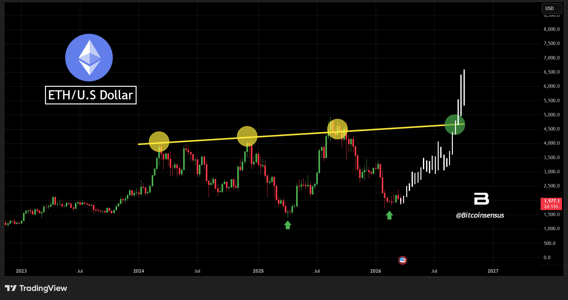 Wir sehen einen aufsteigenden Widerstandskanal (die gelbe Linie, die du oben siehst), der den Preis fast drei Jahre lang im Zaum gehalten hat. Jedes Mal, wenn ETH diese Linie berührt (die gelben Kreise), zieht sich der Markt zurück. Aber, pass auf!, was wir gerade erleben, ist der grüne Kreis: ein explosiver Ausbruch mit riesigen weißen Kerzen, die eine brutale Kaufkraft anzeigen. Wenn du auf die grünen Pfeile unten schaust, hat der Preis immer höhere Tiefs gemacht, was wir im Finanzviertel eine bullische Struktur nennen. Ethereum hat nicht nur die Barriere von $4,500 durchbrochen, sondern scheint auch die Wolken im Blick zu haben, indem es die $6,500 in dieser Prognose übersteigt. 🚀