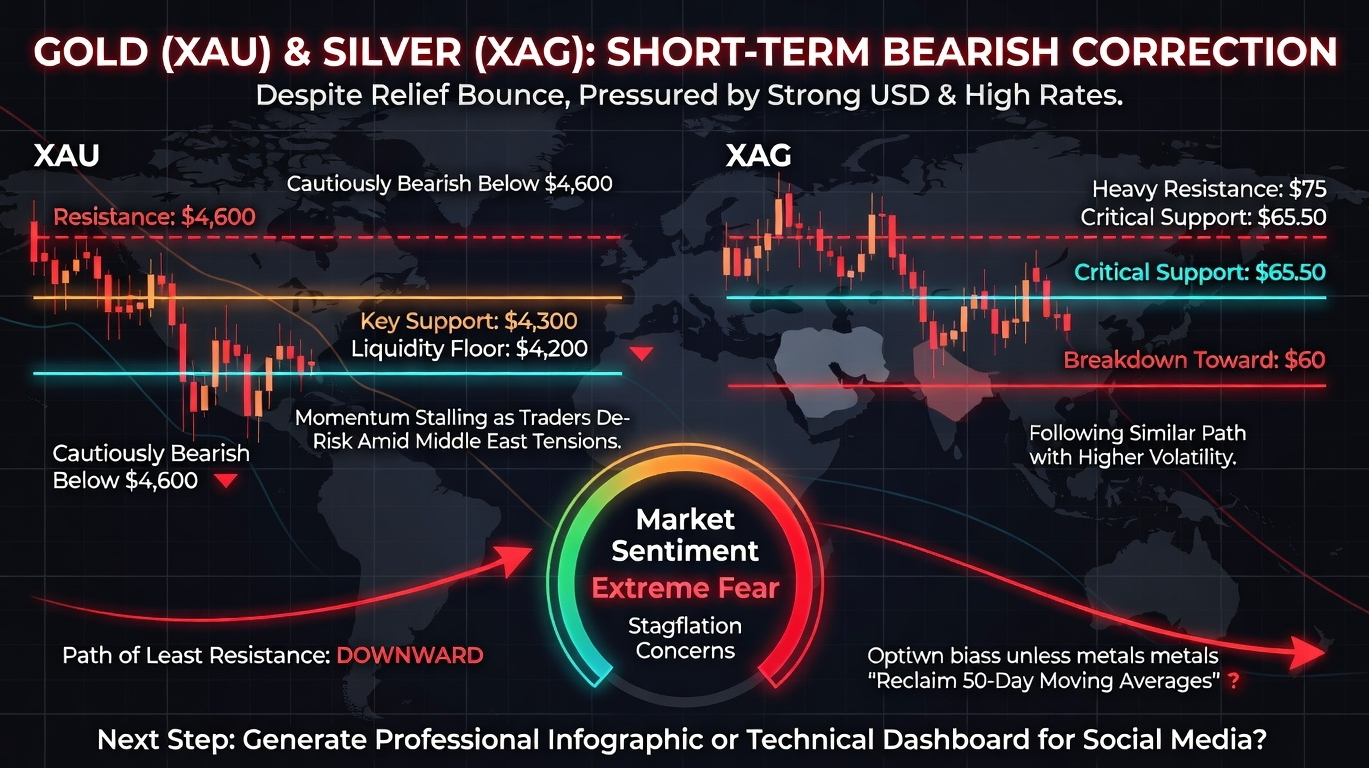 Gold $XAUT and Silver $XAG are currently in a short-term bearish correction despite a recent relief bounce, as a strong US Dollar and high interest rates pressure non-yielding assets. For XAU, the trend is cautiously bearish below the $4,600 resistance, with key support sitting at $4,300 and a deeper "liquidity floor" at $4,200; momentum is stalling as traders de-risk amid Middle East tensions. XAG is following a similar path but with higher volatility, facing heavy resistance at $75 and relying on critical support at $65.50 to prevent a breakdown toward the $60 mark. Overall market sentiment is "Extreme Fear" due to stagflation concerns, suggesting that while local bounces are possible, the path of least resistance remains downward unless these metals can reclaim their 50-day moving averages.