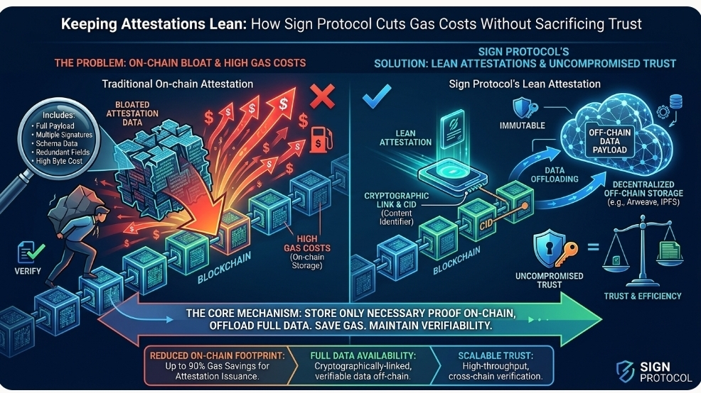 That tension is where this conversation really starts. Because on the surface, attestations sound lightweight. You sign something, you verify something, you move on. But underneath, most systems treat attestations like permanent, heavy records. They store full payloads onchain, repeat metadata, and rely on redundant structures that quietly inflate gas costs. The result is predictable. Higher fees, slower adoption, and a creeping reluctance to use these systems for anything frequent or high volume.