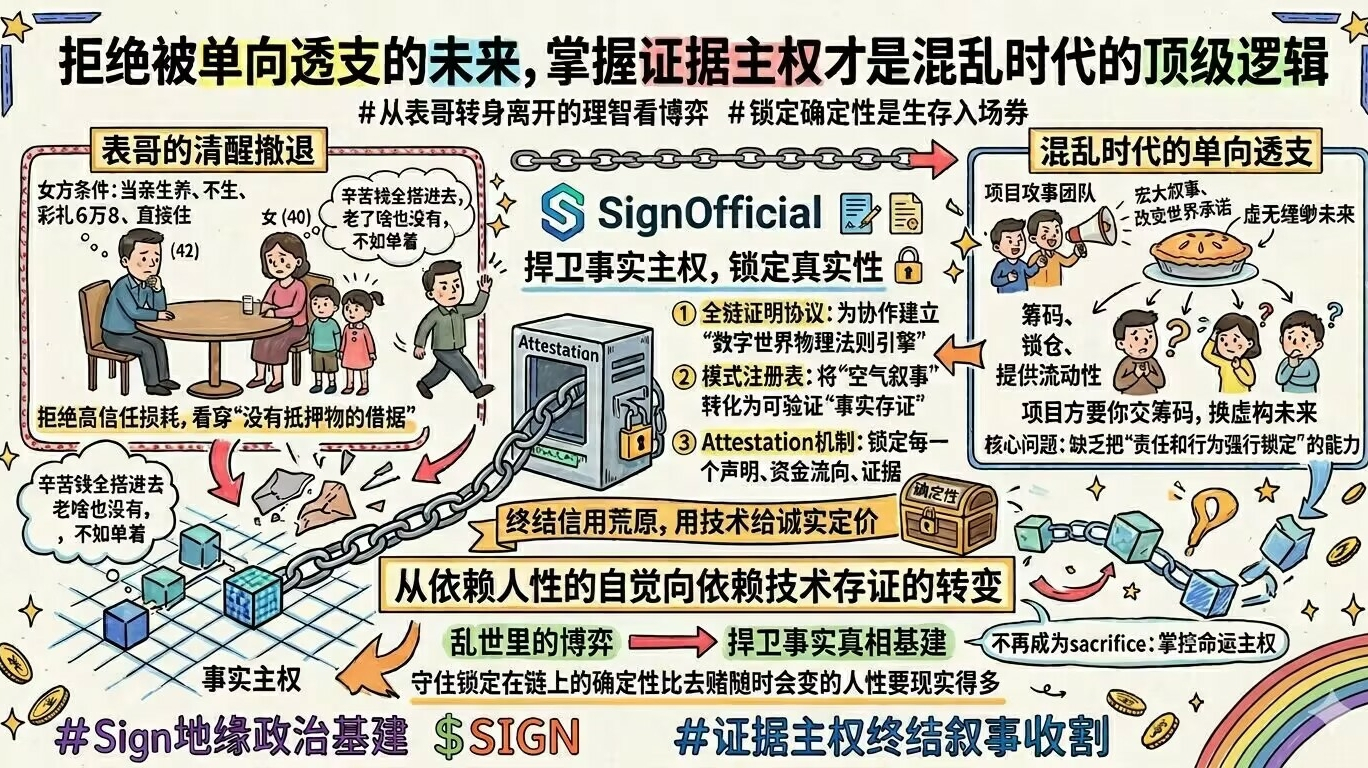 Das ist auch das zugrunde liegende Denken, über das ich in letzter Zeit immer wieder nachdenke @SignOfficial . Es geht darum, ein zentrales Problem zu lösen: Wie können wir die Kosten des gegenseitigen Vertrauens senken? Wir sind es gewohnt, in einer unvorhersehbaren Umgebung immer wieder Fehler zu machen, was eine enorme Verschwendung von Leben darstellt. Was mich an diesem Projekt am meisten berührt, ist sein Schutz des Faktums der Souveränität. Der Grund, warum der Cousin nicht zustimmen kann, ist, dass er entdeckt hat, dass alle wichtigen Aspekte dieser Ehe in einem nicht durchdringbaren Bereich eingeschlossen sind, und das Verhalten der Frau sowie die zukünftigen Risiken sich in einem nicht verifizierbaren Zustand befinden.