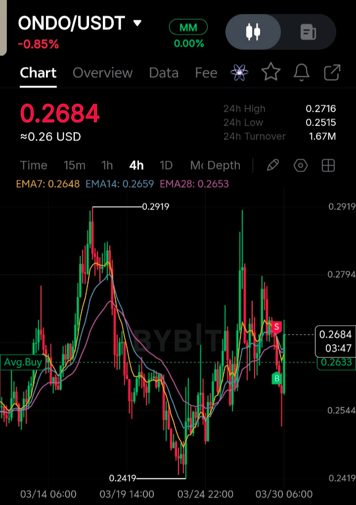 Current Price: $0.26–$0.27 Market is sitting inside a tight range with weak momentum but no breakdown yet. (Real-time price now around $0.26–$0.27, with a 24h range roughly $0.25 to $0.27.) ONDO Compression Before Direction ONDO is moving sideways inside a narrow band. Not trending, not collapsing. This is classic range compression, which usually ends with a sharp move once pressure builds enough. 1️⃣ Active Range Zone (What Price Is Respecting) Right now ONDO is locked between: Support: $0.25 Mid Support: $0.26 Resistance: $0.27 Major Resistance: $0.30 This range is confirmed by repeated bounces between $0.24–$0.30, showing price hesitation rather than trend continuation. If $0.25 breaks clean, downside momentum can accelerate fast. 2️⃣ Market Pressure Read (Buyers vs Sellers) Current pressure: Neutral leaning bearish Why: Price failing to hold above $0.27 Multiple rejections near short-term highs Weak follow-through after small rallies This is not panic selling yet. But buyers are clearly not strong enough to push breakout. That matters. 3️⃣ Breakout vs Breakdown Scenarios Two clean paths from here: Bullish Trigger If price breaks: $0.27 → $0.30 Then likely move toward: $0.32–$0.35 zone Momentum expansion expected there. Bearish Trigger If price loses: $0.25 Then next levels become: $0.23 $0.21 That would confirm short-term weakness. No guessing here. Those are logical continuation zones. 4️⃣ Structure Strength Reality Check ONDO is still far below its all-time high near $2.14, meaning long-term recovery hasn't started yet. But important detail: Price has stopped falling aggressively Now moving sideways instead of dropping That usually means accumulation or indecision phase, not collapse. 5️⃣ Real Risk Zone to Watch Closely Most critical level right now: $0.25 That level is acting like a floor. If it breaks: Market confidence weakens fast. If it holds: Sideways consolidation continues. And consolidation always leads to expansion eventually. Bottom Line ONDO is in a tight compression range, not trending. That means: Not bullish yet Not bearish yet Waiting phase Key levels define everything now: $0.25 → Breakdown Risk $0.27 → Breakout Trigger $0.30 → Momentum Confirmation Next big move depends entirely on which side breaks first. Risk Disclosure: This is not financial advice. Trading involves substantial risk. I hold no ONDO position at writing. DYOR. What is your opinion?
