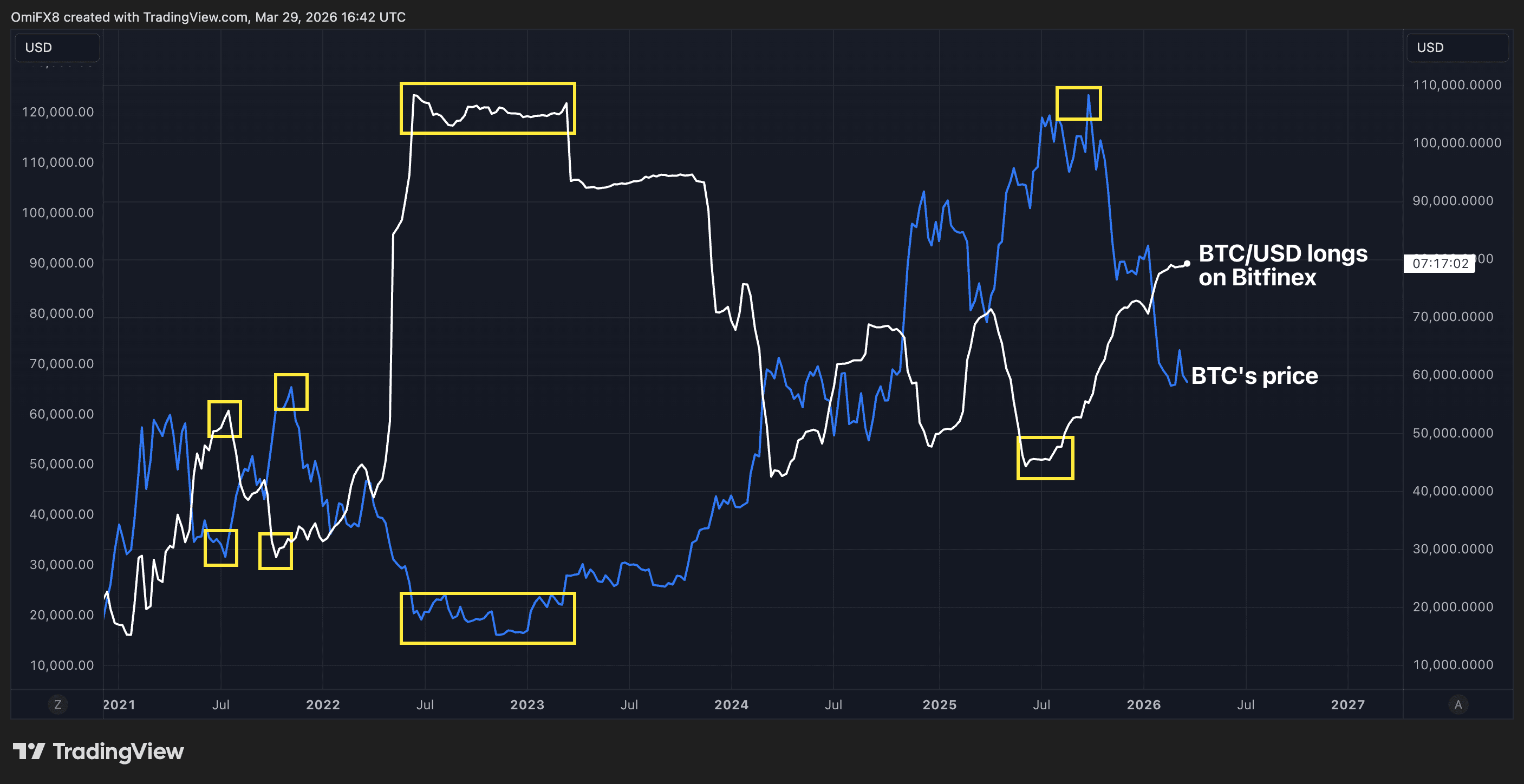 Historically, spikes in Bitfinex BTC/USD longs have acted as a contrary indicator.