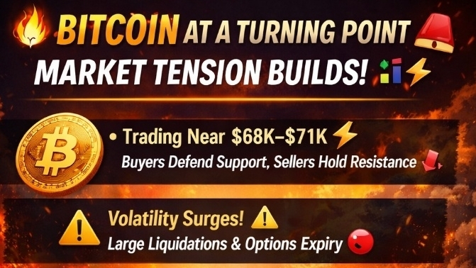 Bitcoin wird im Bereich von $68K–$71K gehandelt und zeigt unruhige Bewegungen, während der Markt nach einer Richtung sucht ⚡ Käufer verteidigen wichtige Unterstützungsniveaus, während Verkäufer in der Nähe des Widerstands aktiv bleiben 📉. Die jüngste Volatilität wird durch große Liquidationen und wichtige Optionsabläufe angeheizt, was die Händler auf Trab hält ⚠️ Gleichzeitig sammeln langfristige Inhaber weiterhin, was ein starkes Vertrauen in zukünftiges Wachstum signalisiert. 💎Das Handelsvolumen und die Versuche eines Ausbruchs nehmen zu, was darauf hindeutet, dass eine entscheidende Bewegung kurz bevorstehen könnte 👀. Wenn BTC den Widerstand überwindet, könnte eine neue Rallye entflammen 🚀 Aber ein Scheitern könnte einen weiteren Rückgang auslösen 📊. Alle Augen sind jetzt auf die nächste Bewegung von Bitcoin gerichtet – es ist ein kritischer Moment ⏳🔥