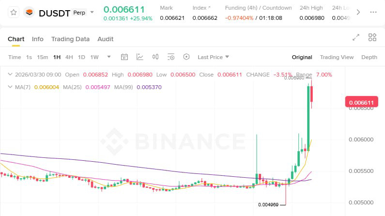 Текущая цена $D /USDT — 0.006611. За последние 24 часа монета показала впечатляющий рост +25%, объёмы торгов резко выросли. RSI (24ч) на уровне 62.51 — зона умеренной силы, ещё не перекупленность, но уже говорит о сильном бычьем импульсе.