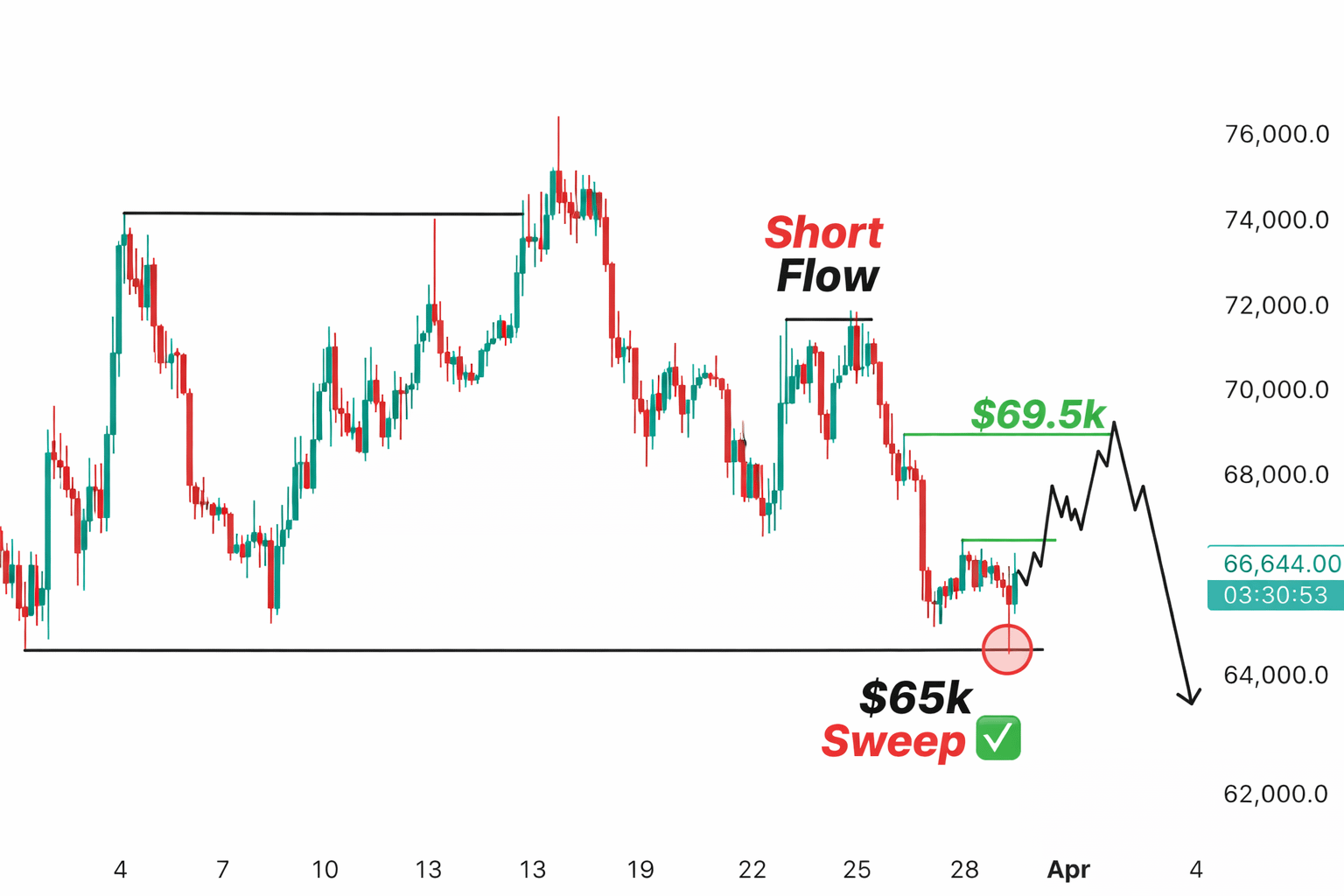 Theo góc nhìn của mình, hiện có hai kịch bản đáng chú ý. Kịch bản đầu tiên là giá có thể hồi lên quanh vùng 69.000 USD sau khi vừa trải qua một đợt thanh khoản lớn. Đây là kiểu nhịp bật lại khá thường thấy sau khi market quét stop mạnh, khiến nhiều người lầm tưởng rằng xu hướng tăng đã quay lại. Nhưng thực tế, những nhịp hồi như vậy đôi khi chỉ là phản ứng kỹ thuật ngắn hạn trước khi thị trường chọn hướng tiếp theo.
