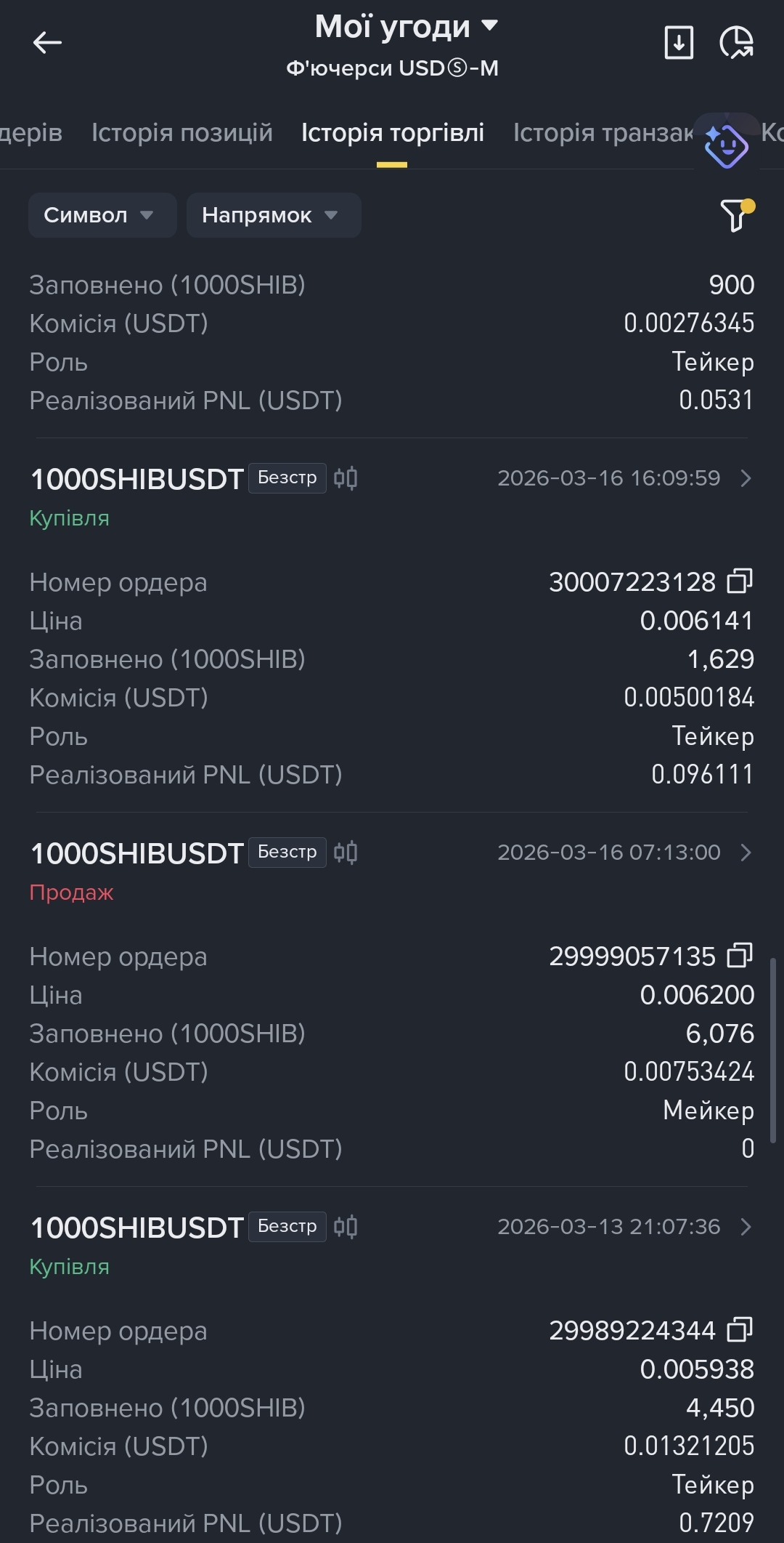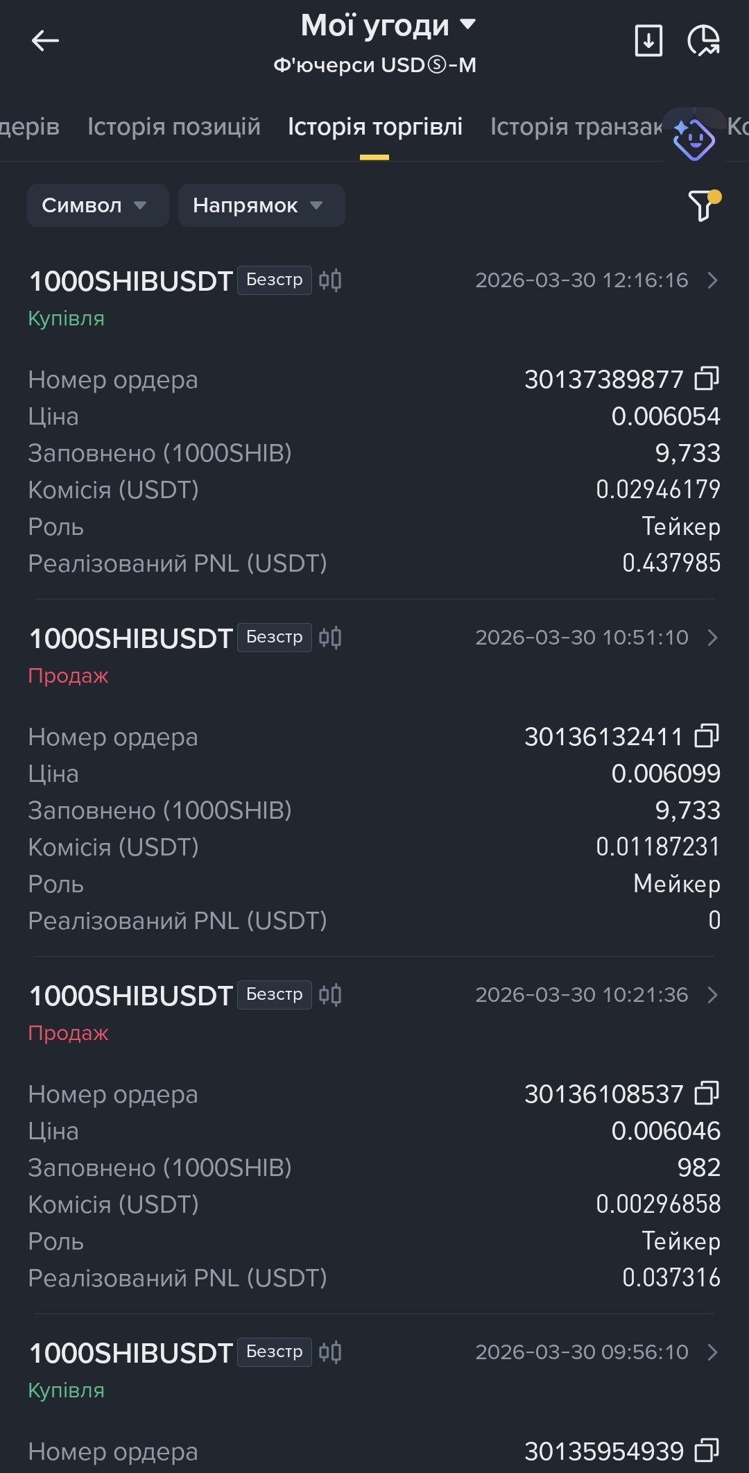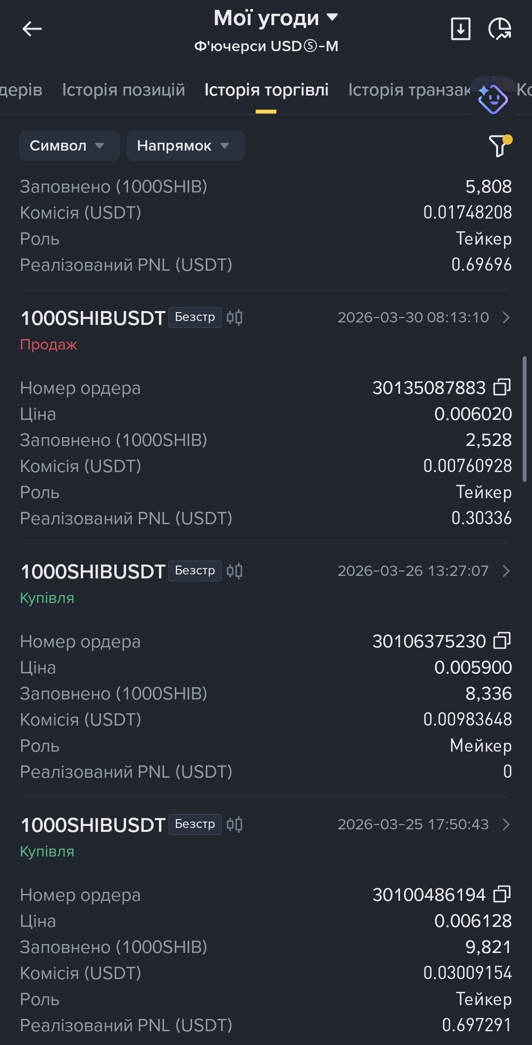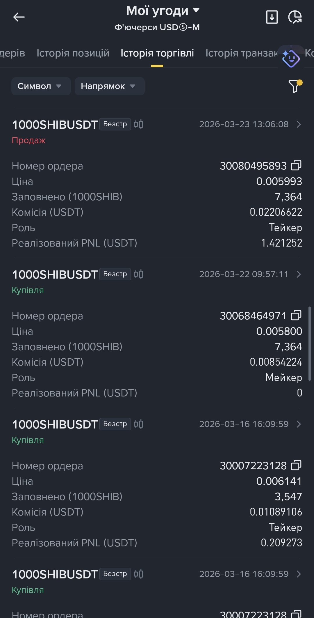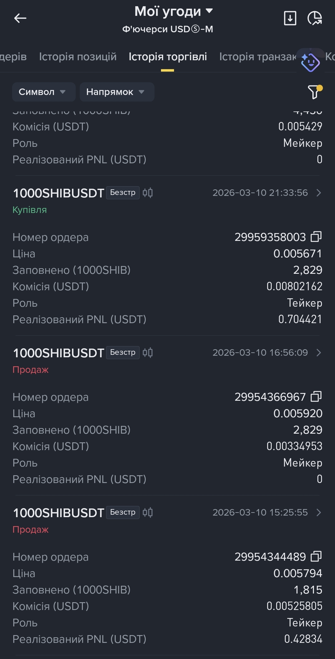 Am 10. März wurde ein Kauf (Купівля) zu 0,005671 mit 2.829 Einheiten als Taker ausgeführt, was nach einer kleinen Provision +0,704421 USDT realisierte PNL einbrachte.