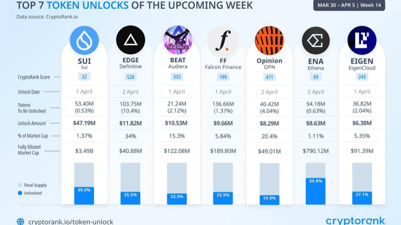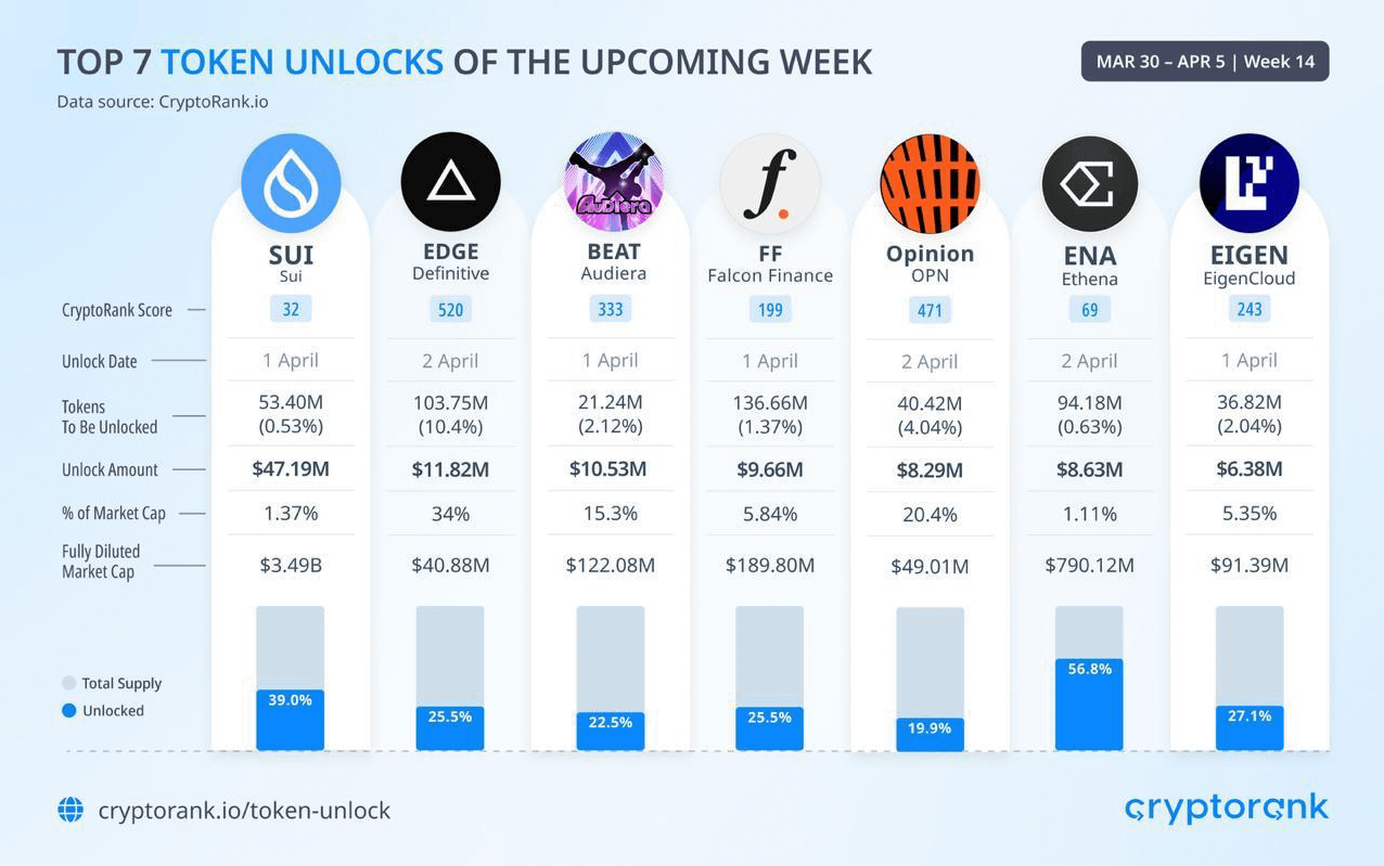 Liste der Entsperrungen von Token und Münzen für die laufende Woche, 30. März - 5. April 2026. Zusammenfassende Informationen von #Cryptorank und #Dropstab.