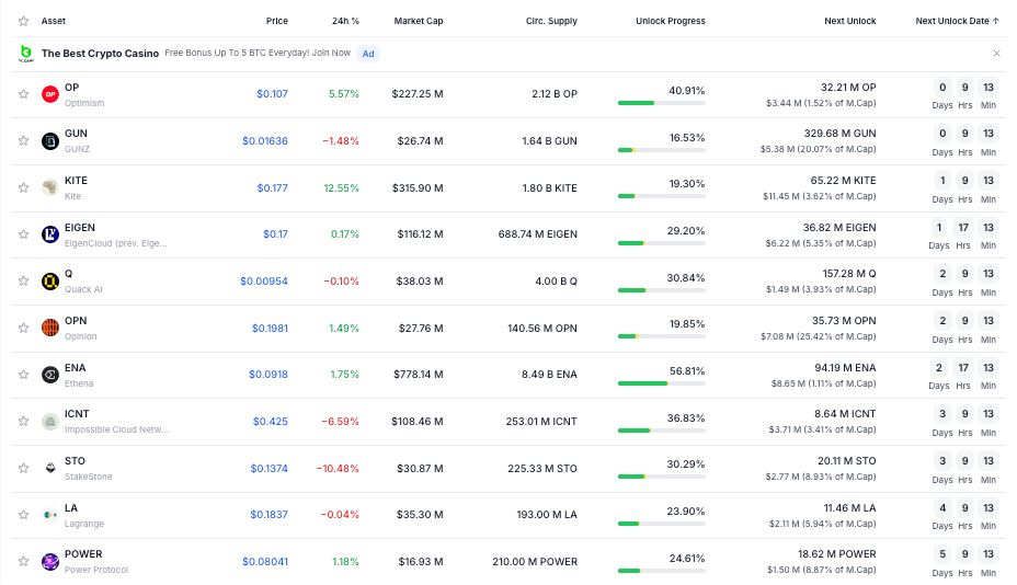 Von den unbedeutenden aus den TOP-300 Krypto-Assets nach Marktkapitalisierung: #OP, #OPN, #ENA. Die vollständige Liste (nicht nur die TOP-300) ist auf den Screenshots. Wie immer sollte man sich die interessierenden Token separat ansehen - wer genau und in welchem Verhältnis Unlocks erhält.