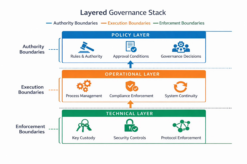The policy layer defines authority and approval conditions. The operational layer enforces processes, compliance, and continuity. The technical layer executes those constraints through key custody, system controls, and enforcement mechanisms that cannot be bypassed.