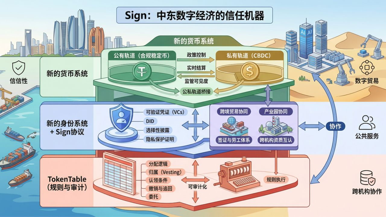 所以顺着这个思路捋下来,Sign 对中东区域经济发展的意义,真不是它能不能再讲个多牛的 Web3 避险故事,而是它能不能成为那台把身份、资金、资本分配和审计全打包进一个框架里的“信任机器”。光有钱不够,光有条链也不够,还得有个能让大家都在同一个证据体系里玩耍的规则层。Sign 现在的野心,就是想当这层“规则的基建”。