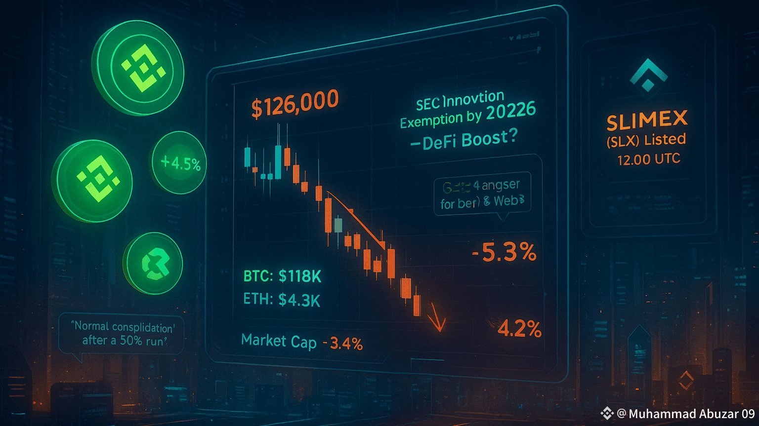 Der Kryptowährungsmarkt hat heute eine Atempause eingelegt, wobei Bitcoin (BTC) um 2,8 % auf etwa 121.100 $ gefallen ist, nach einem kürzlichen Höchststand von 126.000 $. Ethereum (ETH) folgte diesem Trend und fiel um 5,3 % auf 4.480 $, da Gewinnmitnahmen den Markt nach einem wochenlangen Anstieg durchzogen. Die gesamte Marktkapitalisierung für Kryptowährungen schrumpfte um 3,4 %, was einen breiteren Rückgang der Stimmung widerspiegelt. Trotz des Rückgangs hielten einige Altcoins dem Trend stand. Binance Coin (BNB) stieg um 4,5 % auf 1.280 $, angetrieben von Optimismus über die Expansion des Binance-Ökosystems. Kleinere Token wie ZRX (+3,2 %) und NEAR (+2,1 %) verzeichneten ebenfalls Gewinne, während der Meme-Coin FLOKI um 2,7 % fiel. Die Volatilität unterstreicht einen Markt, der mit überhitzten Bedingungen und bevorstehenden Katalysatoren kämpft. Eine wichtige Entwicklung heute war die Ankündigung von SEC-Vorsitzenden Paul Atkins über eine vorgeschlagene "Innovationsausnahme" für Krypto-Projekte, die voraussichtlich bis Anfang 2026 Gestalt annehmen wird. Die Mitteilung fiel inmitten einer Regierungsstilllegung in den USA, und der Plan zielt darauf ab, die Vorschriften für Blockchain-Startups zu straffen, was potenziell neue Kapitalzuflüsse freisetzen könnte. "Das könnte ein Wendepunkt für DeFi und Web3 sein", sagte ein Krypto-Analyst auf X. Das institutionelle Interesse bleibt robust. GraniteShares hat einen Antrag für 3x gehebelte ETFs eingereicht, die auf Bitcoin, Ethereum, Solana und XRP abzielen, was das wachsende Interesse von Wall Street an Krypto-Engagement signalisiert. In der Zwischenzeit listete die Alpha-Plattform von Binance SLIMEX (SLX), ein Gesundheitstechnologie-Token, mit dem Handel, der heute um 12:00 Uhr UTC beginnt.