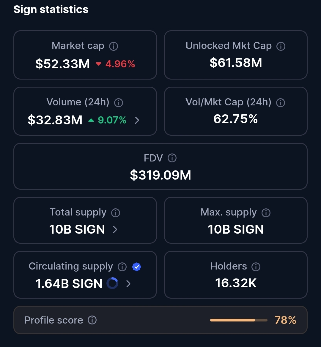 I'm referring to CoinMarketCap as one of my usual sources for DYOR. From the data I've seen, SIGN currently has a market cap of around $52.33 million, with a price drop of around -4.96%. Meanwhile, daily volume is around $32.83 million, actually increasing by around +9.07%.