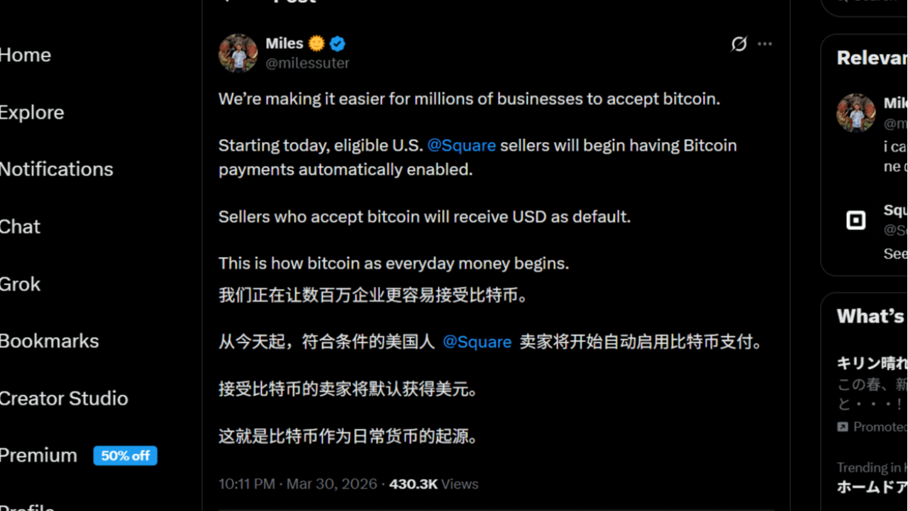 Jack Dorsey这步棋走得很狠,opt-out机制直接把400万商家推进来,不用你主动申请,你已经在里面了。食品车、咖啡馆、街边小店——这些过去跟加密货币八竿子打不着的场景,一夜之间成了比特币的"日常消费"战场。
