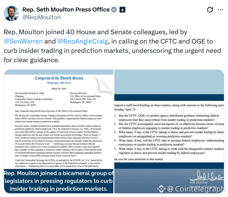 The group is requesting a briefing and answers to a range of questions by April 13, including whether the CFTC has investigated or received any reports of federal employees engaging in insider trading on prediction markets.