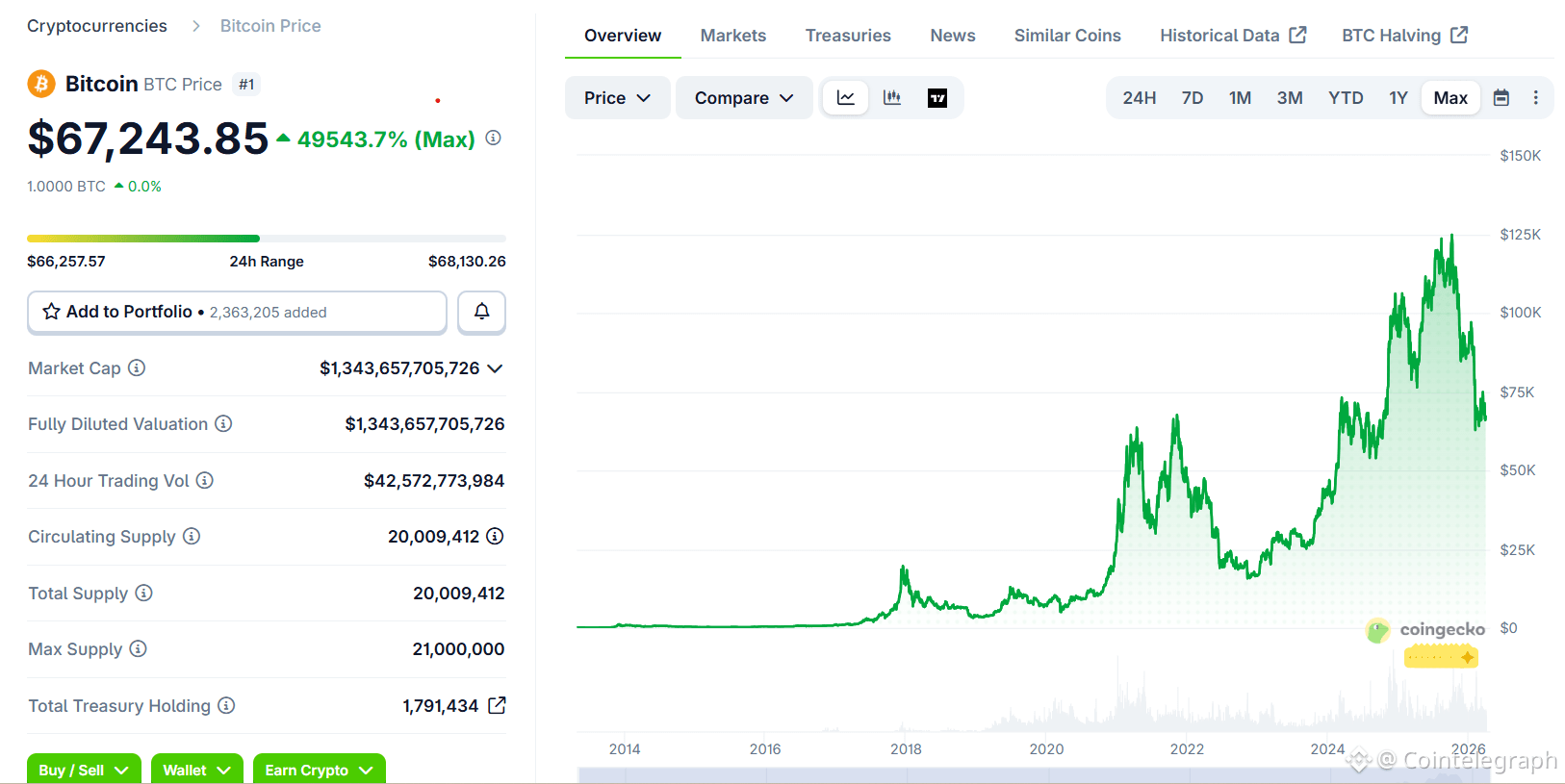 Bitcoin has since surged to a peak above $126,000 in October 2025 and traded at around $67,000 at the time of writing, according to CoinGecko, making the original 2,900 BTC worth $365 million at its peak (a price increase of roughly 46,500%), and around $194 million today (24,800%) at current levels despite recent volatility.