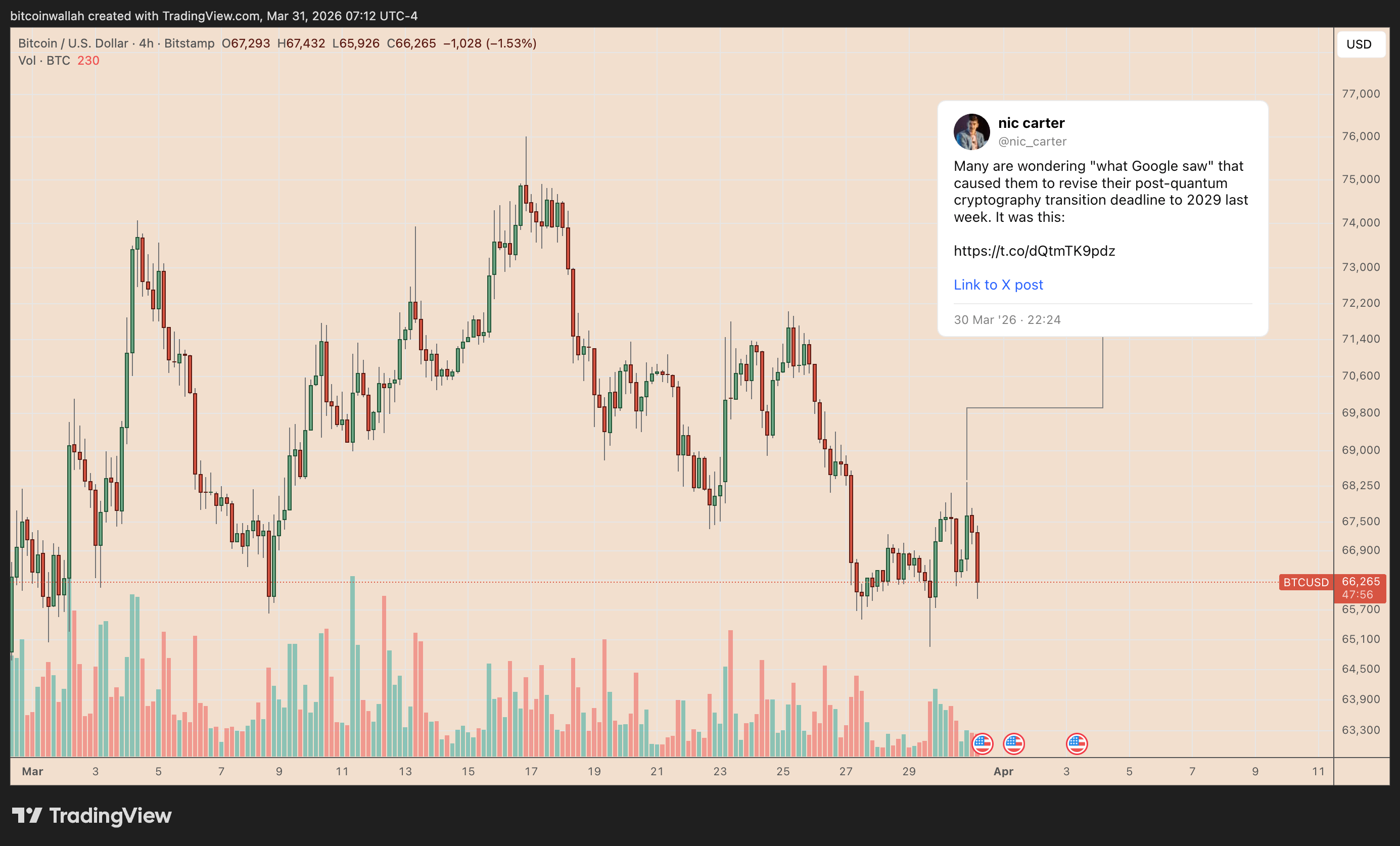 Der Preis von Bitcoin stagnierte, als Analyst Nic Carter den Google-Bericht in einem viralen Dienstagspost verstärkte, wobei BTC danach um 3,5% fiel.