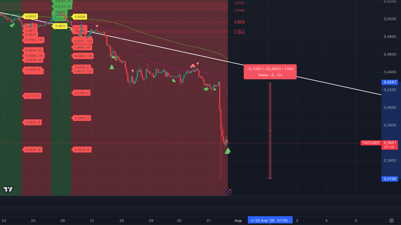 Anlässe? Es gibt keine Anlässe. Weder Ankündigungen, noch Veröffentlichungen, noch Hacks. Technisch gesehen hat der Preis jedoch die einzige Liquiditätszone getestet, die nach dem Durchbruch der psychologischen 0,5$ unten geblieben ist. Im Tages-TF geht es um die Zone 0,3239-0,3429$.