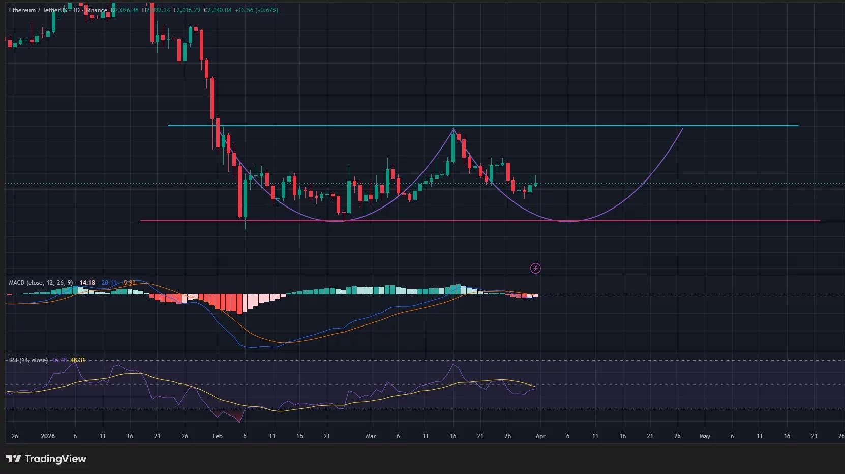 Im Tageschart scheint der Ethereum-Preis ein großes Doppelbodenmuster zu formen, eines der zuverlässigsten bullishen Umkehrmuster in der technischen Analyse. Der Boden der Struktur liegt bei 1.800 $, während die Nackenlinie der Formation bei 2.400 $ sitzt.