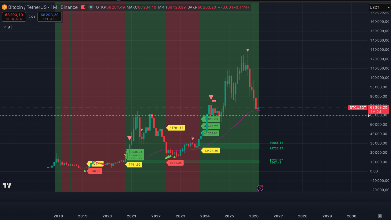 Vor allem ist es wichtig - die Reihe roter Monatskerzen, die seit September 2025 lief, wurde unterbrochen. Wir erinnern daran, dass Oktober 2025 die erste rote Kerze in einer langen Reihe von Monaten war und mit einem Kurs von 114.048$ eröffnete, mit einem potenziellen Hochpunkt gemäß unserem Indikator.