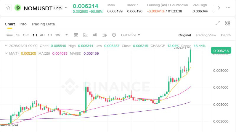 Nomina ($NOM , бывший Omni Network) сегодня в центре внимания: цена 0.006214 USDT, рост за 24 часа +90%, объёмы торгов превышают $120M. Это классический памп с сильным импульсом — проект с бэкграундом от Pantera Capital и Coinbase Ventures активно развивает unified trading platform для on-chain рынков.