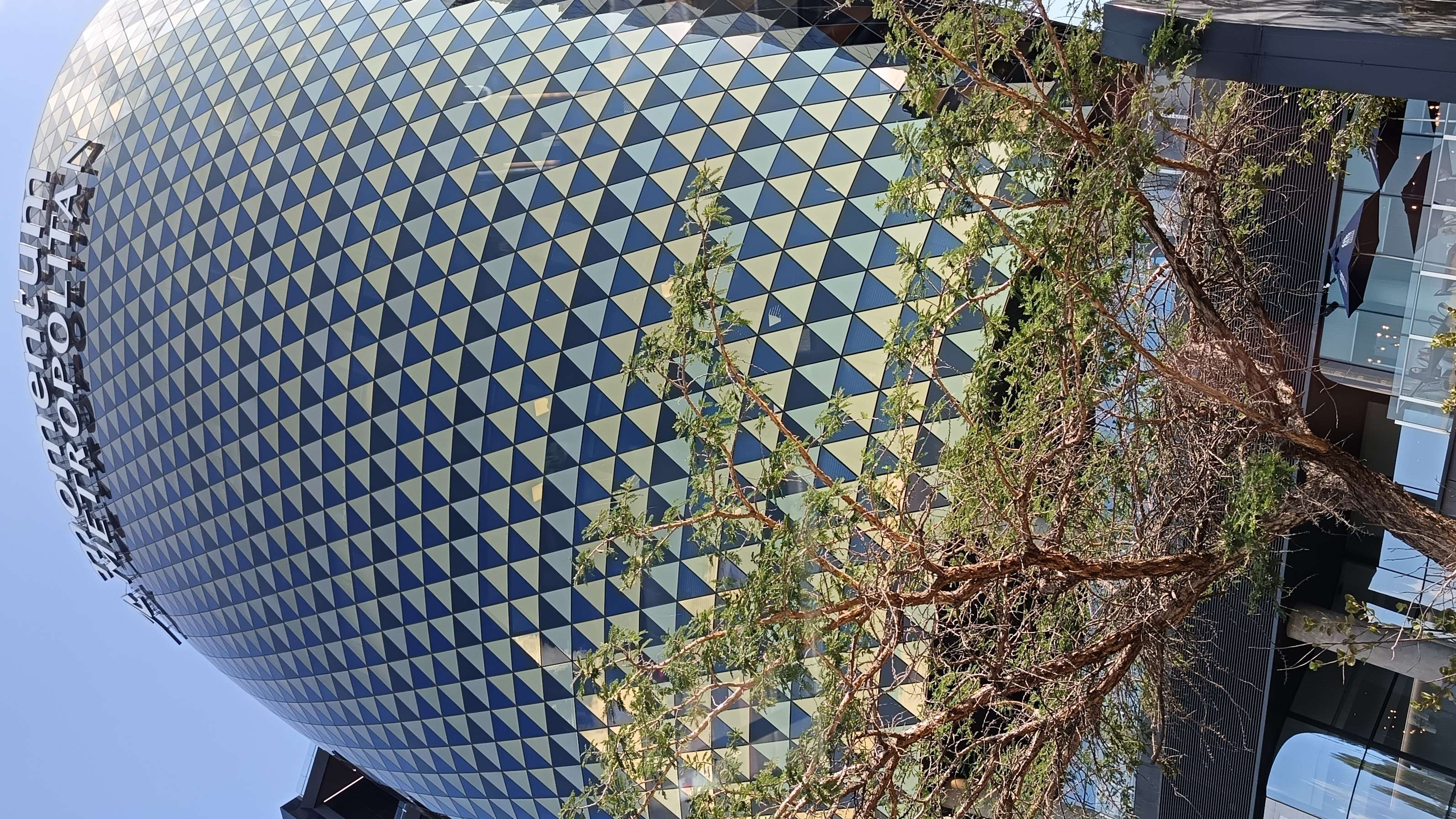 I was looking closely at the glass on that building. It’s not just two-tone glass; it’s actually made of squares that are split point-to-point into two triangles. One half is gold or silver, and the other half is a tinted polaroid glass. I noticed the gold is actually a double row or line going all the way around the building, while the silver is a single row also going all the way around. It creates this amazing mirror illusion that changes as you drive by. It makes perfect sense for a place where the Scoin shop is—it looks like a vault made of precious metals!