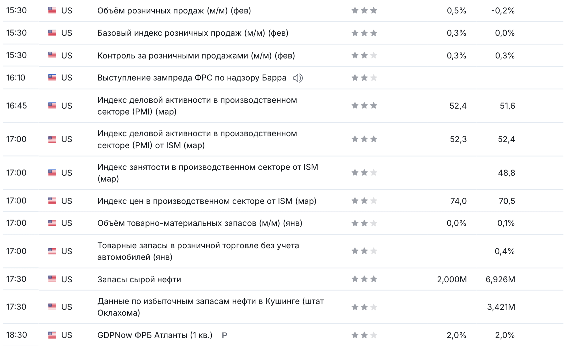 - 15:30 nach Kiew und MSK / 17:30 nach Astana - Umsatz im Einzelhandel in den USA, Basis-Index der Einzelhandelsumsätze und Kontrolle über den Einzelhandel für Februar. Wichtig für die Bewertung der Verbrauchertätigkeit.