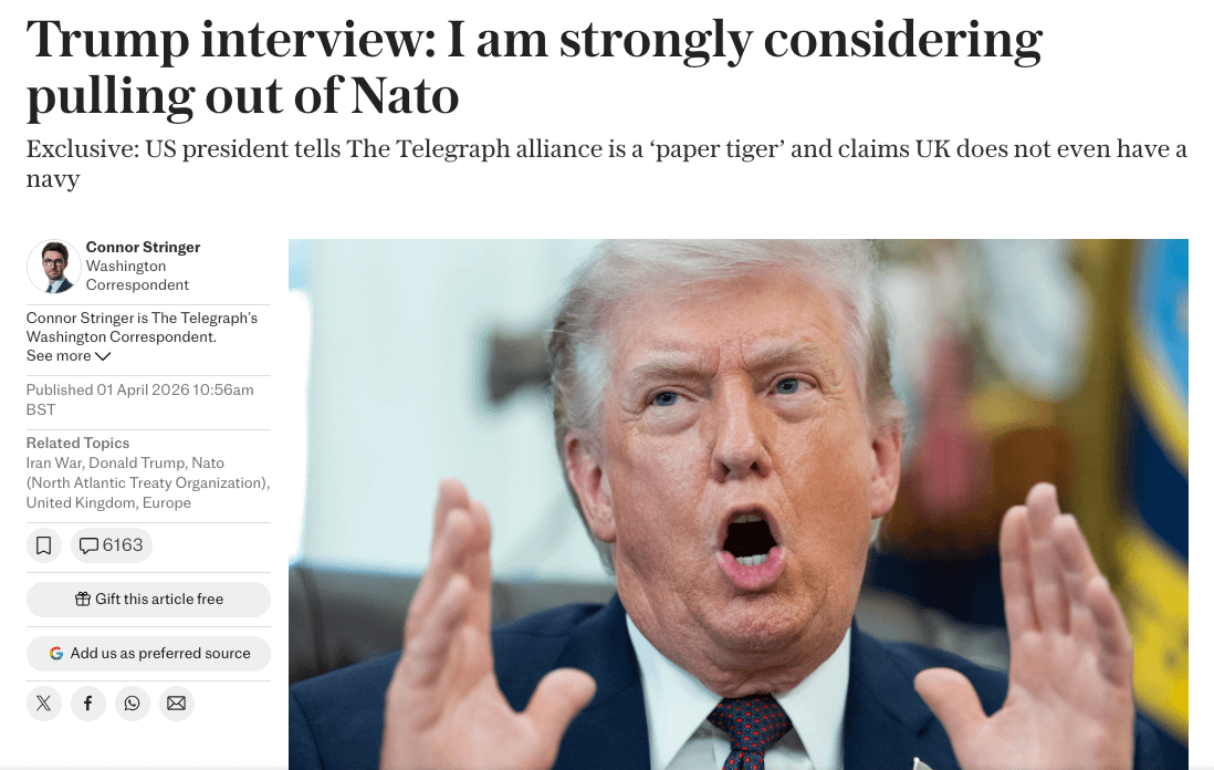 Пока известно только то, что Трамп собирается выразить "свое отвращение" к НАТО, в контексте того что ряд стран Альянса не предоставили свои военные базы американцам для войны против Ирана. И Трамп уже заявил, что рассматривается вариант выхода США из НАТО.