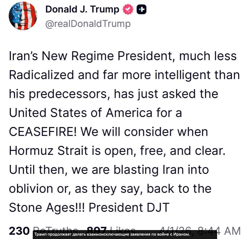 "Президент нового режима Ирана, гораздо менее радикальный и значительно более интеллектуальный, чем его предшественники, только что попросил у Соединенных Штатов Америки прекращение огня! Мы рассмотрим, когда Ормузский пролив будет открыт, свободен и ясен. До тех пор мы уничтожаем Иран или, как говорят, возвращаем его в каменный век!"