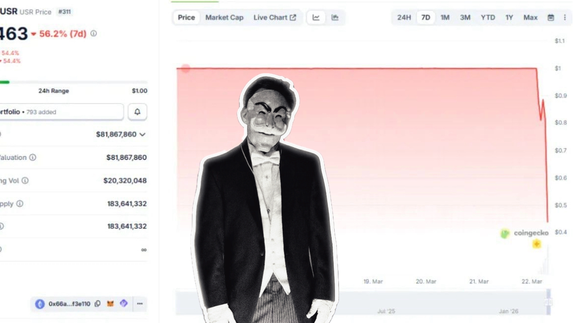 Weiter geht's nach klassischer Manier. Nachdem er sich kostenlose Millionen gesichert hatte, wartete der Hacker nicht und begann aggressiv, USR auf den Markt zu werfen. Die Liquidität hielt nicht stand — die Orderbücher trockneten einfach aus, und der „Stablecoin“ fiel innerhalb kurzer Zeit um etwa 74%.