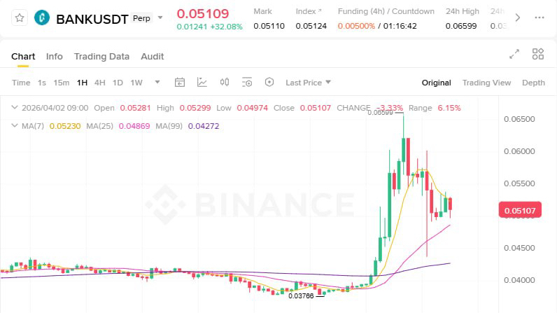 $BANK сейчас торгуется на уровне 0.05109 USDT с мощным ростом +32% за последние 24 часа. RSI (24h) на отметке 64.73 — зона умеренной перекупленности, но ещё не экстремальная. Это говорит о сильном импульсе покупателей, при этом остаётся пространство для дальнейшего движения вверх без немедленного отката.