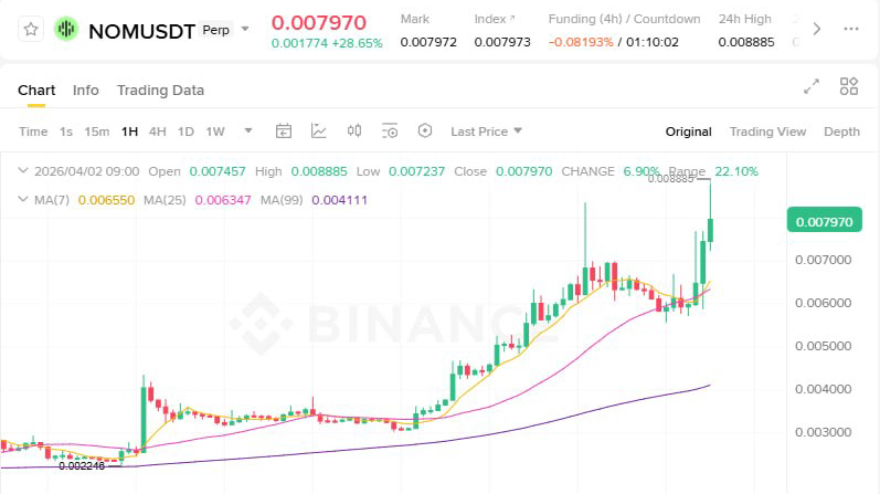 $NOM (Nomina) сейчас торгуется на уровне 0.007970 USDT (+28% за 24 часа). Объёмы выросли в разы, рынок явно заметил монету. RSI(24h) на отметке 80.27 — зона сильной перекупленности. Это классический сигнал: импульс мощный, но вероятность отката высока.