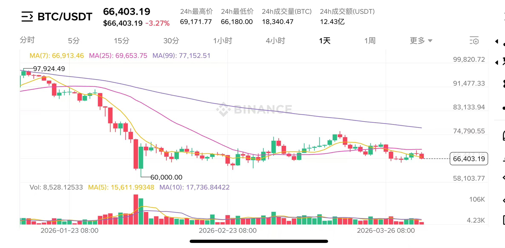 Bis jetzt,$BTC liegt der Preis bei etwa 66.403 USD, mit einem Rückgang von etwa 3,27 % innerhalb von 24 Stunden und einer Marktkapitalisierung von etwa 1,33 Billionen USD.