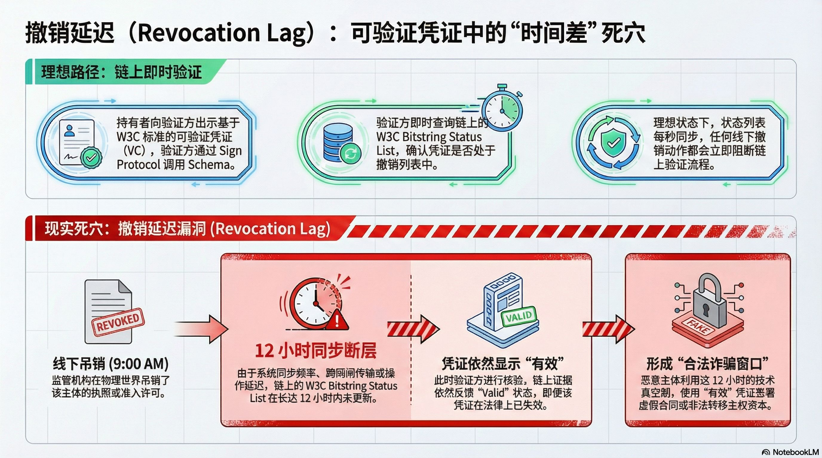 假设一家不合规的供应商,在今天上午 9 点被当地政府线下吊销了营业执照。但在层层上报的过程中,链上的这个状态列表没有做到秒级广播。那么在接下来的 12 个小时里,这家本该死亡的供应商,依然能拿着数学上绝对合法的链上凭证,在跨国网络里畅通无阻地签合同、骗取资金。黑客根本不需要去破解你的智能合约,他们只需要利用现实与链上状态同步的这个物理时间差,就能完成合法的抢劫。