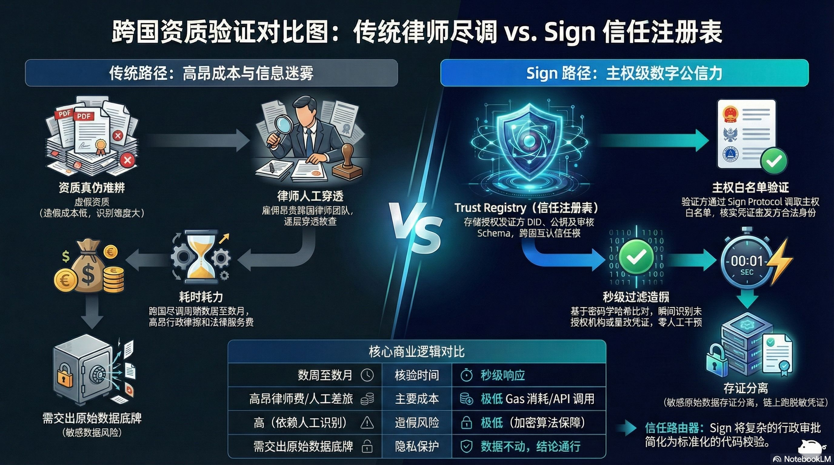 当我们在跨国贸易中去核验一个供应商的资质时,系统首先去扫这个 Trust Registry。它不光验证密码学的真伪,它更在验证“发证人的合法性”。如果给你背书的只是个不知名的野鸡节点,哪怕你的零知识证明(ZK)算得再完美,系统依然会把你拒之门外。这种“带主权门槛的信任机制”,才是数字凭证能在国家间互认的底牌。$SIGN
