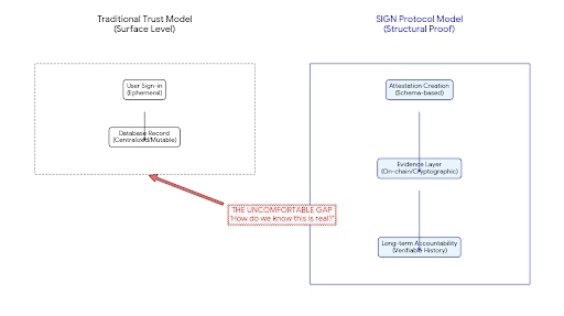 The way I see it SIGN is not trying to be an app people interact with every day or a flashy identity tool that promises quick verification. It feels more like a base layer that focuses on recording proofs in a way that does not fall apart later. Instead of simply saying you can trust this person or this data it tries to preserve the reason behind that trust so it can still be checked long after the moment has passed