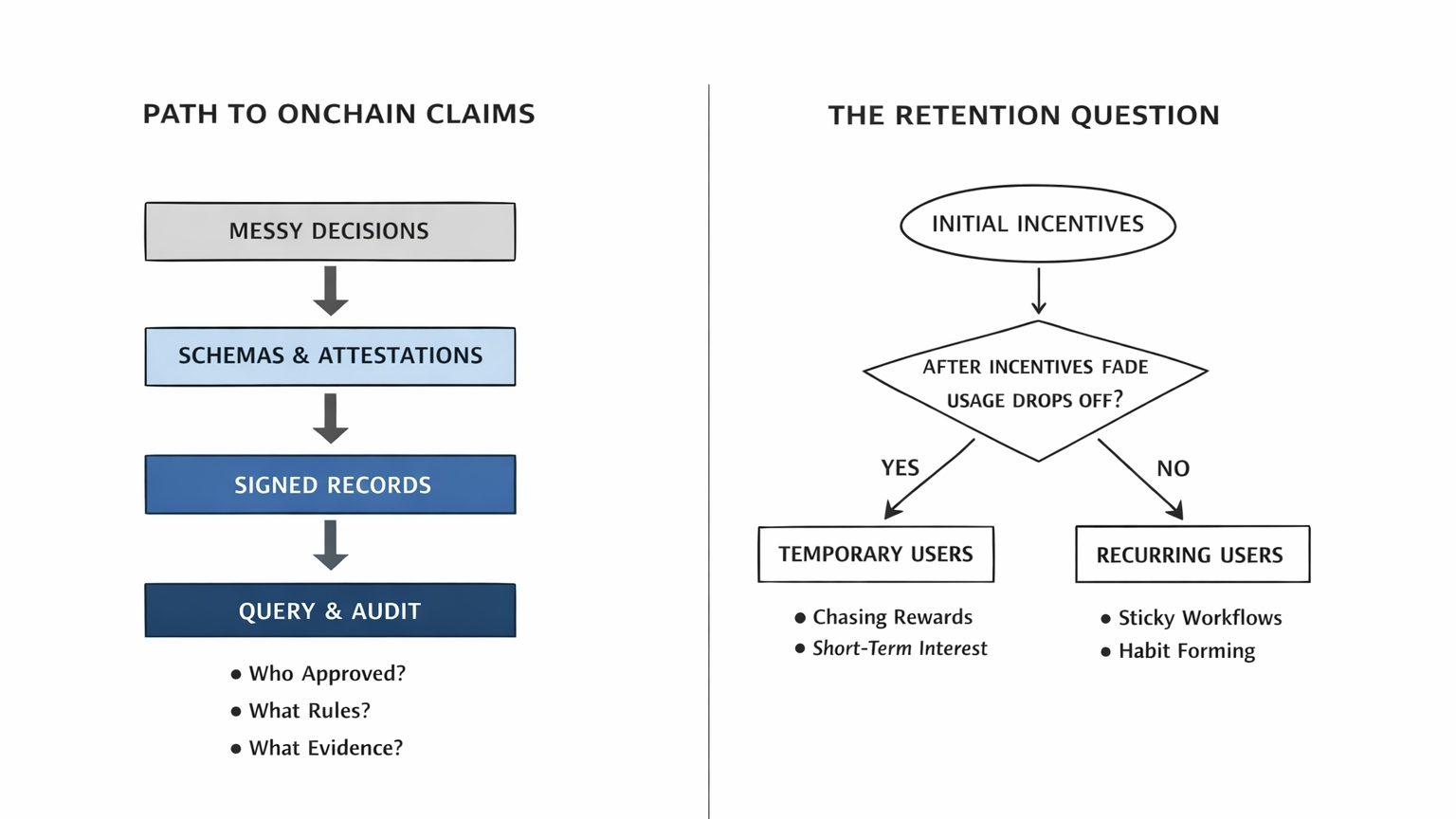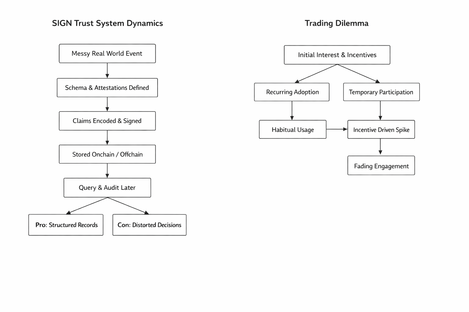 What makes this project interesting to me is also what makes it dangerous to read too quickly. Sign is built around schemas and attestations, which is a tidy way of saying it tries to turn messy claims into structured, signed records that can be stored onchain, offchain, or in a hybrid model, then queried later through SignScan’s REST and GraphQL APIs. The docs are pretty clear about the ambition here. This is meant to answer ugly real world questions like who approved something, under which authority, under what rules, and with what evidence. That is useful. Very useful. But here’s the tradeoff people underplay. The easier you make claims to query later, the more pressure there is to shape decisions earlier so they fit the system cleanly. That is where distortion can begin. As a trader, I do not care about that in an abstract governance seminar way. I care because it affects what kind of usage actually repeats. Today SIGN is trading around $0.0323 to $0.0327, with a market cap near $53 million, about 1.64 billion tokens circulating out of a 10 billion max supply, and roughly $32 million to $39 million in 24 hour volume depending on the tracker snapshot. Fully diluted valuation is about $328 million. That gap matters. The market is not pricing Sign like a dead microcap, but it is also not pricing the full future supply as if demand is already proven. Price is still roughly 75 percent below the all time high of $0.1311. So the market is telling you two things at once. There is interest, and there is doubt. That is usually where the best work starts. Now here’s the thing that keeps my thesis from turning into a comfortable bull post. Structured trust systems do not just record reality. They can quietly influence it. If a government program, capital distribution system, or compliance workflow knows it will later be judged by what can be queried, operators start optimizing for what is easy to encode. Edge cases get squeezed. Human judgment gets translated into schema fields. Exceptions become expensive. In Sign’s own design, schemas define the format, attestations follow them, and hooks can whitelist attesters, charge fees, or reject actions by reverting the whole transaction. That is efficient. It is also a form of pre-filtering reality. Think of it like accounting rules. They help you inspect the business later, but they also shape how people behave before quarter end. That is why the Retention Problem matters so much here. For Sign, retention is not just daily active wallets or a nice spike in search traffic. It is whether institutions, apps, and distribution programs keep coming back to the same trust rails because they actually reduce recurring friction. If usage does not repeat, then all this beautiful structure becomes rented attention with paperwork attached. The recent Orange Basic Income program is a good example of the tension. Sign launched a 100 million SIGN OBI program, with Season 1 running from March 20 to June 18, 2026, to reward self custody and staking behavior. I get the logic. Move supply off exchanges, encourage longer holding, reduce reflexive sell pressure. But incentives can manufacture participation faster than they manufacture habit. A user who stakes because rewards are attractive is not the same as a system operator who cannot leave because the workflow is genuinely useful. Traders need to know that difference. The realistic bull case is still there, and I do think it deserves numbers instead of hand waving. If Sign can turn even a small part of its evidence layer pitch into sticky operational demand, today’s roughly $53 million market cap and roughly $328 million FDV can still look early relative to what regulated identity, capital distribution, and verification infrastructure could justify. The current volume to market cap ratio is high enough to show active interest, not total apathy, and the project does have a product story traders can actually explain without making things up. Queryable attestations, hybrid storage, programmable hooks, and audit friendly records are not fake problems. They are real. If the market starts to believe those rails are becoming default infrastructure for repeat workflows, re-rating can happen fast from a base this small. But the bear case is stronger than a lot of people want to admit. Supply is the obvious one. Tokenomist shows the next SIGN unlock is scheduled for April 28, 2026, and the vesting schedule extends into 2030. That means any retention story has to fight dilution in real time. And the project’s own strengths can become a weakness if adoption stays narrow. A system built to make claims queryable across chains and storage layers can still fail to create durable user dependence. Clean architecture does not guarantee repeat economic behavior. I have seen traders confuse explainability with demand before. They are not the same thing. One helps you understand the machine. The other tells you whether anyone needs to keep using it. So what would change my mind either way? On the bullish side, I want to see repeated usage that survives after incentives cool off. Not one campaign. Not one listing rumor. Not one burst of volume. I want evidence that teams or institutions are building workflows they do not want to abandon because Sign makes compliance, eligibility, or distribution easier every single week. On the bearish side, I am watching for the opposite. More structured records, more announcements, more incentives, but no real habit loop underneath. That would tell me the project is getting better at documenting value than creating it. If you are trading SIGN here, do not just ask whether the claims can be queried later. Ask what behavior gets bent earlier so those claims look clean, and ask whether anyone keeps showing up when the reward schedule matters less than the workflow. That is the whole trade to me. Not whether Sign can explain decisions after the fact, but whether it can become part of decisions peopl