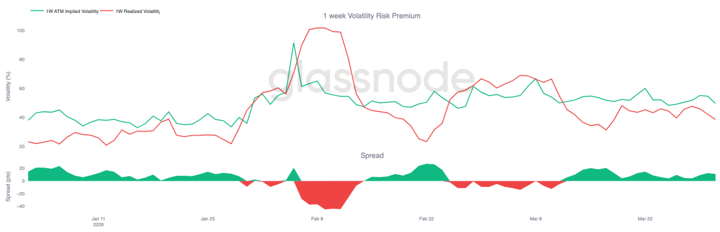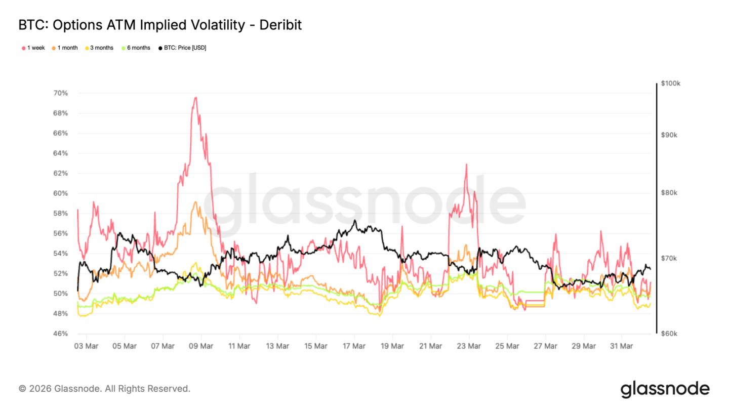 期权市场隐含波动率普遍下降:1 周期约 51%,3 个月期 49%。