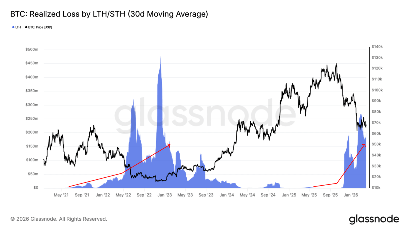 长期持有者每日的已实现亏损目前约 2 亿美元,说明主动投降已经开始。历史经验告诉我们:如果这一指标降到每日 2,500 万美元以下,才算卖方力量大幅衰竭,也才是市场筑底的关键前提。