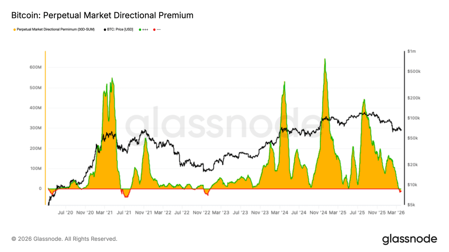 永续合约的方向性溢价已经压缩到 中性附近,略低于零。