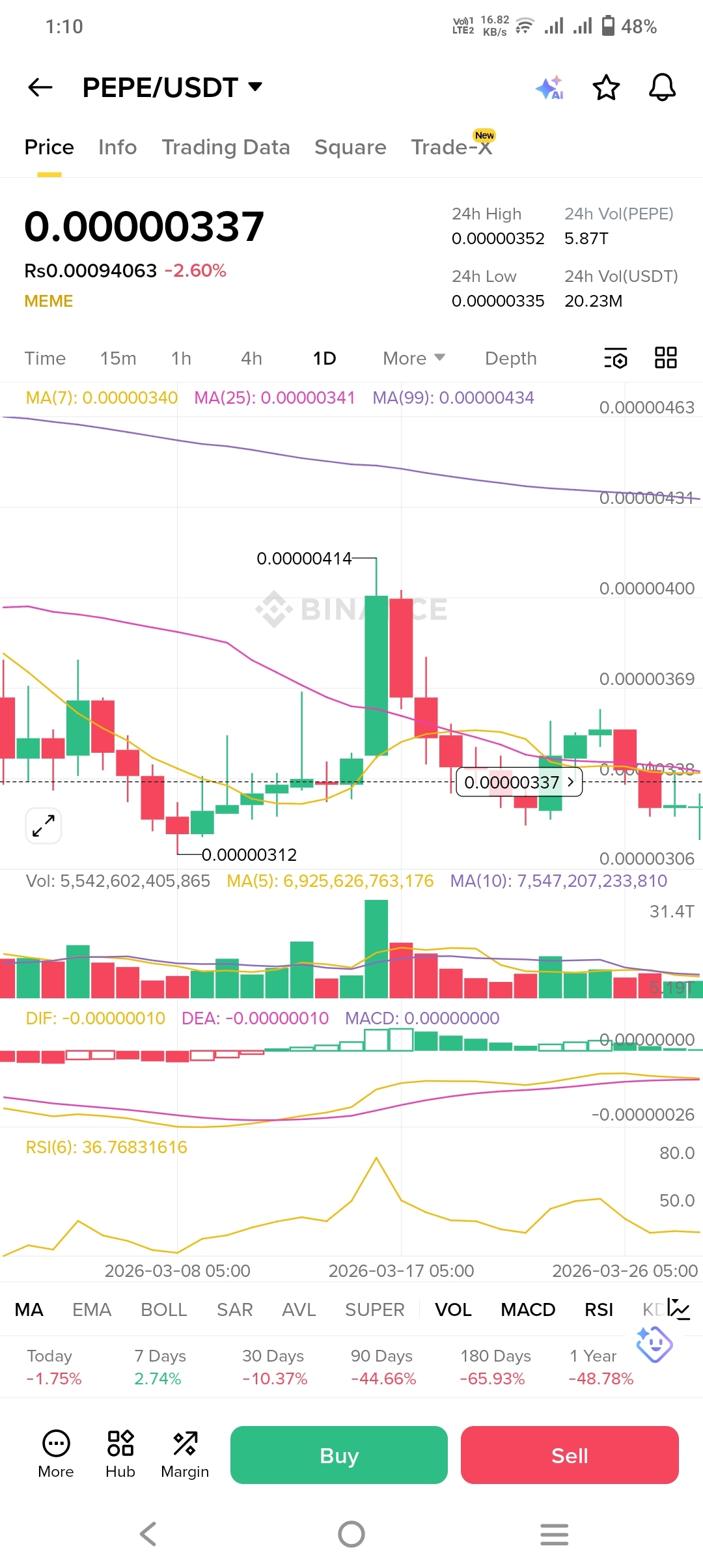 Dosto, $PEPE is waqt aik ahem mod par hai. Chart (1D) dikha raha hai ke price $0.00000338 ke gird ghoom rahi hai.