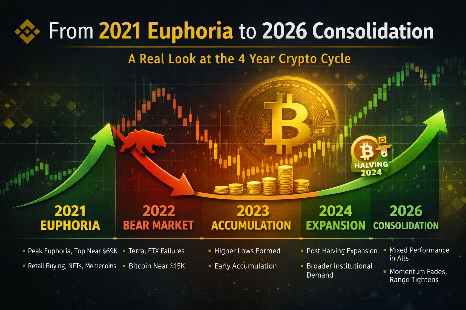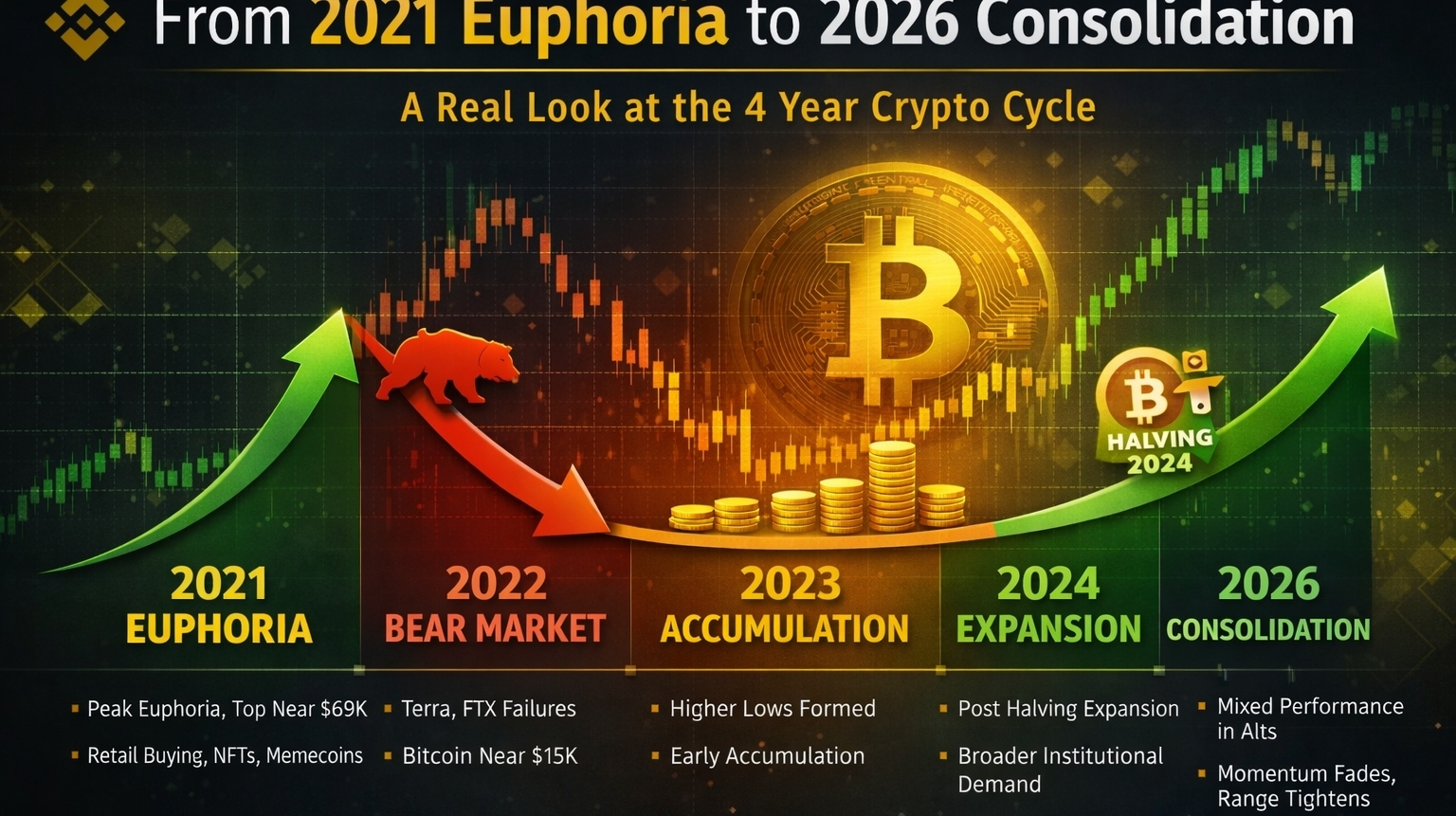 Ich habe die Struktur des Krypto-Marktes in den letzten vier Jahren verfolgt und das Muster ist schwer zu ignorieren. Der Markt bewegt sich nicht zufällig. Er neigt dazu, durch Phasen zu rotieren, die von Liquidität, Bitcoin-Halving-Zyklen & der Psychologie der Anleger angetrieben werden. Betrachtet man den Höhepunkt von 2021 bis zur aktuellen Struktur von 2026, zeigt der Zyklus einen vollständigen Übergang von Euphorie zu Kapitulation, dann Erholung, Expansion & jetzt Konsolidierung.